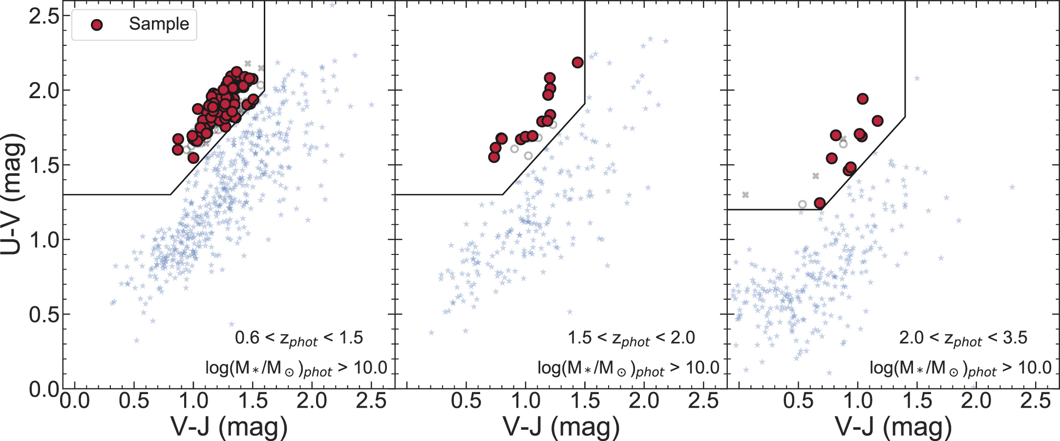 V − J vs. U − V rest-frame color–color diagram (“UVJ” plot) of all CLEAR galaxies with 0.6 < zphot < 3.5 and ﹩\mathrm{log}({M}_{\mathrm{phot}}/{M}_{\odot })\gt 10.0﹩. Galaxies that fall into the quiescent wedge (upper left region in each panel) are candidate quiescent galaxies and constitute our parent sample. The red larger points show galaxies that satisfy our final sample selection of 0.7 < zgrism < 2.5 and ﹩\mathrm{log}({M}_{\mathrm{grism}}/{M}_{\odot })\gt 10.5﹩ (and satisfy our X-ray and 24 μm selection, see Section 2.1). Blue stars show galaxies that fail the quiescent galaxy selection (i.e., they are star-forming galaxies). Gray X’s mark quiescent galaxies that were rejected (mostly because they have grism redshifts outside our final redshift range). Open gray circles show quiescent galaxies that are rejected for falling under our final stellar-mass limit ﹩\mathrm{log}({M}_{* }/{M}_{\odot })\gt 10.5﹩.