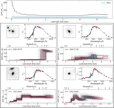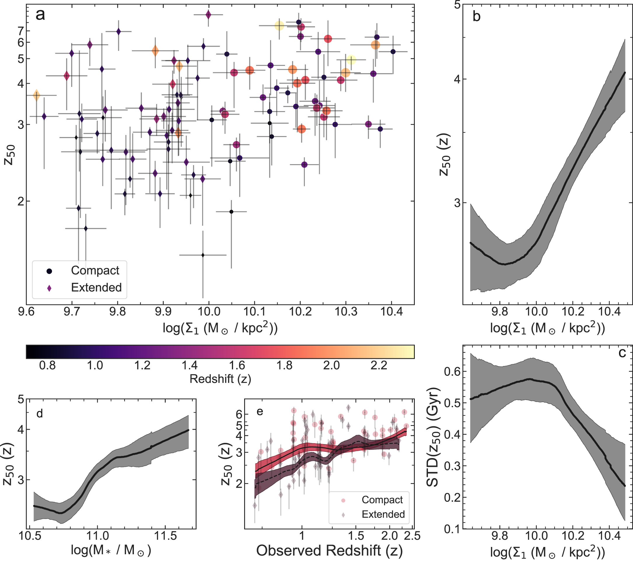 Relationship between formation redshift ﹩{z}_{50}﹩ (the redshift by when 50% of the stellar mass had formed), the observed redshift zgrism, and Σ1 (the stellar-mass surface density within 1 pkpc). (a) shows ﹩{z}_{50}﹩ as a function of ﹩\mathrm{log}({{\rm{\Sigma }}}_{1})﹩ for the quiescent galaxies in our sample. Galaxies with ﹩\mathrm{log}{{\rm{\Sigma }}}_{1}/({M}_{\odot }{\mathrm{kpc}}^{-2}))\gt 10﹩ (﹩\lt 10﹩) are shown as circles (diamonds). The color and size of the all points scales with increasing zgrism. Galaxies with ﹩\mathrm{log}{{\rm{\Sigma }}}_{1}/({M}_{\odot }{\mathrm{kpc}}^{-2})\lt 10﹩ span a larger range of ﹩{z}_{50}﹩. Galaxies with log Σ1 / (M⊙ kpc−2) > 10 favor higher formation redshifts of ﹩{z}_{50}\gt 3﹩. (b) shows the change in ﹩{z}_{50}﹩ as a function of ﹩\mathrm{log}({{\rm{\Sigma }}}_{1})﹩ using the Locally Weighted Scatterplot Smoothing (LOWESS) algorithm with bootstrapping to estimate the 68% confidence region. (c) shows the scatter in ﹩{z}_{50}﹩ as a function of ﹩\mathrm{log}({{\rm{\Sigma }}}_{1})﹩ (using LOWESS). Galaxies with higher Σ1 tend toward higher ﹩{z}_{50}﹩ with lower scatter. (d) shows the change in ﹩{z}_{50}﹩ as function of ﹩\mathrm{log}{({M}_{* }/{M}_{\odot })}_{\mathrm{grism}}﹩ using LOWESS. Higher mass galaxies tend toward higher ﹩{z}_{50}﹩, though this relation is less steep while there is a continued rise between ﹩{z}_{50}﹩ vs. the stellar-mass surface density, Σ1. (e) shows the formation redshift, ﹩{z}_{50}﹩, against the observed redshift. Galaxies with ﹩\mathrm{log}({{\rm{\Sigma }}}_{1})﹩/ ﹩({M}_{\odot }\,{\mathrm{kpc}}^{-2})\gt 10﹩ (﹩\lt 10﹩) are indicated by red (purple) points, using the LOWESS algorithm to show the trend. We see here that more compact galaxies (i.e., with higher Σ1) tend to have higher z50, particularly for ﹩z\lesssim 1.25﹩.