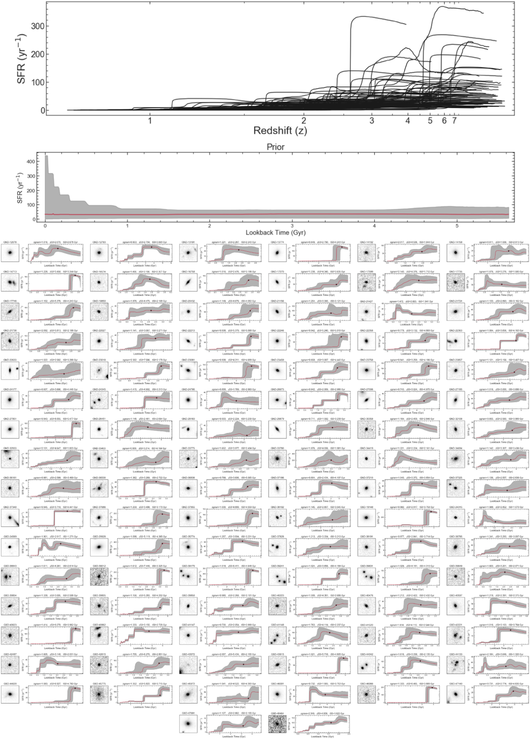 Galaxy cutouts and SFHs (ordered by formation redshift) for the sample of galaxies. The first plot shows all SFHs, plotted at their appropriate redshifts. The second plot shows the prior we used to fit our nonparametric SFHs. The following plots are then the galaxy cutouts and SFHs for each galaxy, with their formation redshift marked with a point, and relevant information shown at the top of the figure.