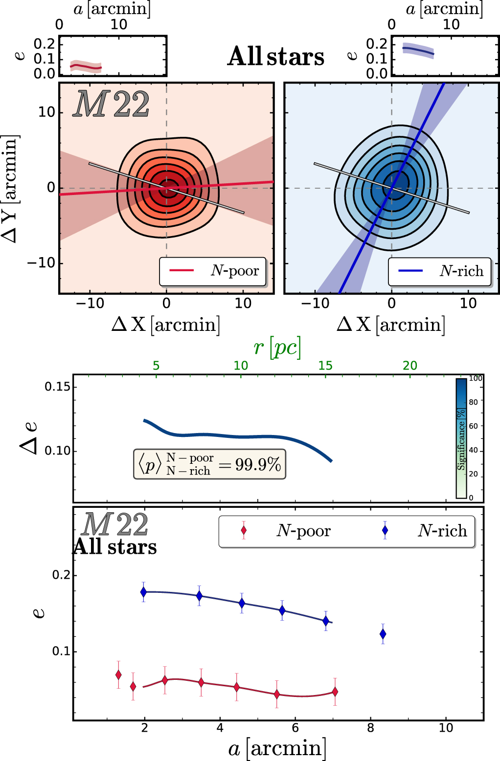 Top panels: same as Figures 3 and 9 for the N-poor (red, left panel) and N-rich (blue, right panel) populations in M22. Bottom panel: ellipticity profile as in Figures 4 and 10.
