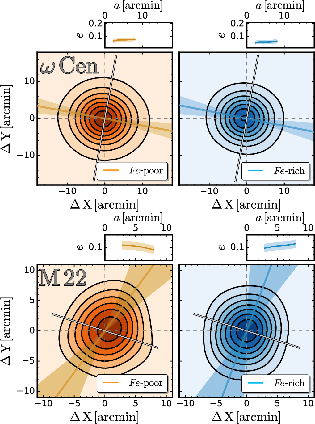 Density maps of metal-rich and metal-poor populations in ω Centauri (top panels) and M22 (bottom panels). The quantities on the abscissa and ordinate are the projected stellar coordinates relative to the cluster center. The color levels are indicative of stellar density and are based on the 2D binned kernel-density estimate (Wand 2015). The iso(density contours are shown in each panel together with the rotation axis as determined in Sollima et al. (2019) solid black-gray line). Red and blue lines in the top insets show the ellipticity against the major axis, while the shaded regions represent the 1σ confidence bands.