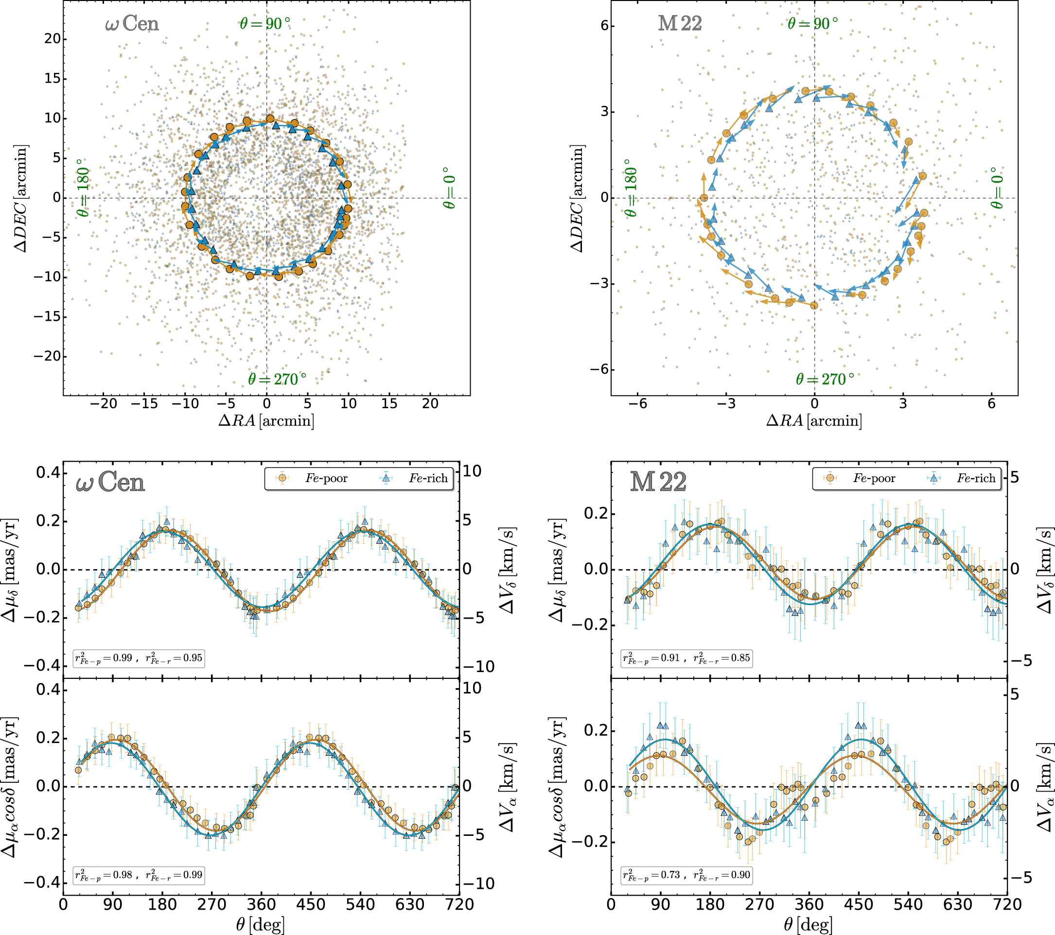 Top panels: relative positions of Fe-poor and Fe-rich RGB stars in ω Centauri and M22 with respect to the cluster center. Orange and cyan arrows indicate the average motion computed in each circular sector, as described in Section 4.2, scaled by a factor of 5 for clarity. The radial distances of the arrows correspond to the median radius of stars in each population. Bottom panels: ﹩{\rm{\Delta }}{\mu }_{\alpha }\cos \delta ﹩ and ﹩{\rm{\Delta }}{\mu }_{\delta }﹩ as a function of θ for the two analyzed clusters. The bottom left insets show the value of the r2 parameter, which is indicative of the quality of the fit.