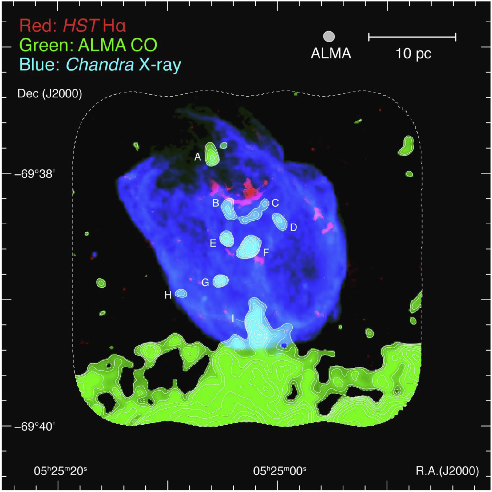 RGB image of N132D obtained with the HST Hα (red), ALMA 12CO(J = 1–0) (green), and Chandra X-rays in the energy band 0.5–7.0 keV (blue). The integration velocity range is from 262.0 km s−1 to 268.4 km s−1. The contours represent the integrated intensity of CO, whose levels are 1.2 (﹩\sim 3\sigma ﹩), 1.5, 2.0, 3.0, 4.0, 6.0, 9.0, 13.0, 18.0, and 24.0 K km s−1. The region enclosed by the dashed line indicates the area observed with ALMA. The CO clouds, named A to I, discussed in Section 4.3 are indicated.