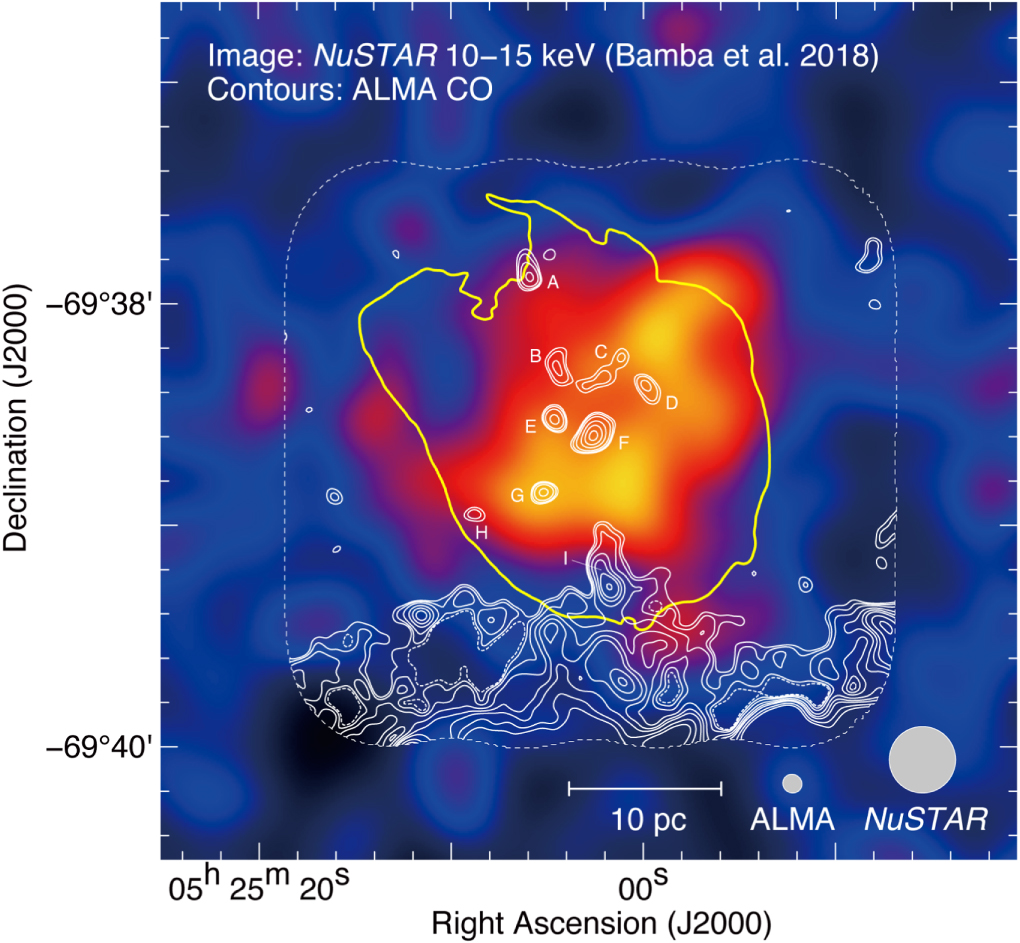 Map of hard X-ray emission (E: 10–15 keV) obtained with NuSTAR (Bamba et al. 2018). The white and yellow contours indicate the ALMA 12CO(J = 1–0) and the boundary of the X-ray shell. The contour levels and integration velocity range of CO are the same as in Figure 5. The beam size and scale bar are also shown in the bottom right corner of the panel. The CO clouds A to I are also indicated.