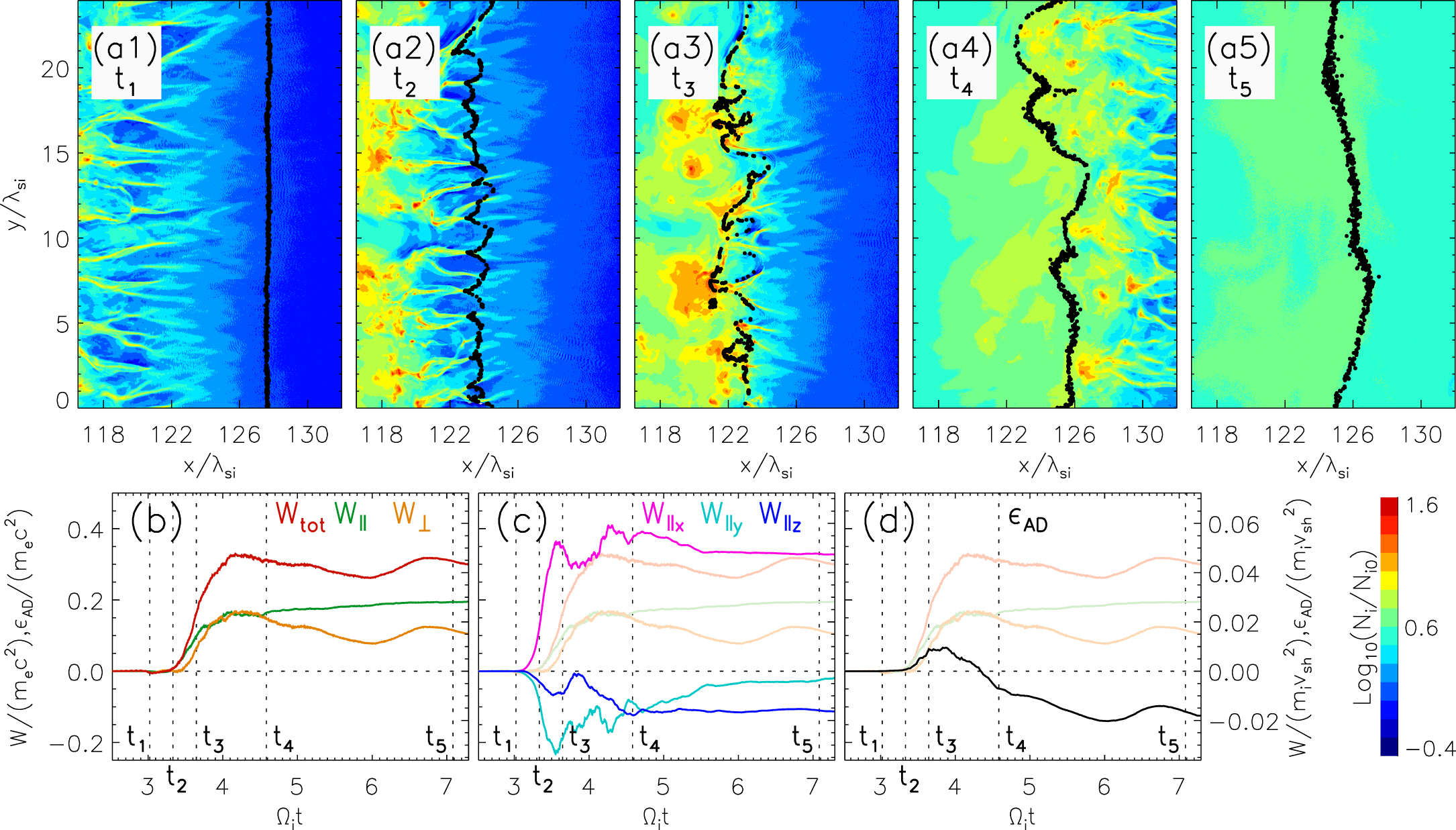 Evolution of the work components of traced electrons for run B2. Panels (a1)–(a5) present the positions of traced electrons (black dots) at the time ﹩{t}_{1}\mbox{--}{t}_{5}﹩ on density maps of the shock region. Panel (b): the temporal evolution of the total work done by electric field (﹩{W}_{\mathrm{tot}}﹩, red line), the parallel work component (﹩{W}_{\parallel }﹩, green line), and the perpendicular work component (﹩{W}_{\perp }﹩, orange line). Panel (c): magenta, light blue, and dark blue lines are x- (﹩{W}_{\parallel x}﹩), y- (﹩{W}_{\parallel y}﹩), and z-components (﹩{W}_{\parallel z}﹩) of the parallel work. Panel (d): evolution of the adiabatic component (WAD; see Section 3.6). Faded curves in panels (c) and (d) represent lines from panel (b). Scales for the bottom panels are given in terms of ﹩{m}_{{\rm{e}}}{c}^{2}﹩ and ﹩{m}_{{\rm{i}}}{v}_{\mathrm{sh}}^{2}﹩. The vertical dashed lines in panels (b), (c), and (d) are time markers for ﹩{t}_{1}-{t}_{5}﹩; the horizontal dashed line is the zero level.
