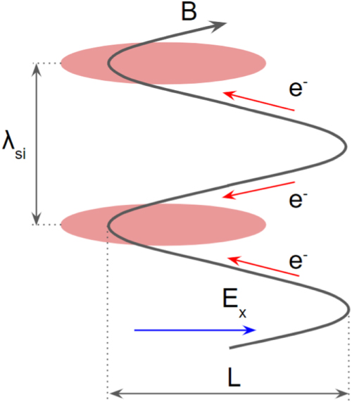 Scheme of electron heating by the shock potential in the shock foot. Red ellipses indicate dense Weibel filaments. The motions of electrons are designated by red arrows. The blue arrow is the shock potential, Ex, in the shock foot. ﹩{\lambda }_{\mathrm{si}}﹩ represents the Weibel instability wavelength and L is a measure of a magnetic field line widening because of Bx amplification.