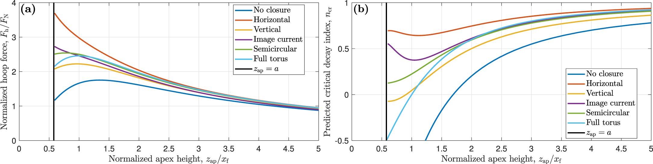 (a) Numerically calculated hoop force and (b) critical decay index as a function of zap/xf for ε = 0.5, ℓi = 0.5, and nI = 0. Here Fh and ﹩{n}_{\mathrm{cr}}^{}﹩ have been plotted for all of the current closures shown in Figure 2, as well as for no closure, the unphysical situation where there are no return currents. The plots all begin at zap = a because below this height, part of the rope would be below z = 0 and the model breaks down. The hoop force calculations have been done numerically via the Biot–Savart law. For plots varying the other two input parameters, ε and ℓi, see Figure 9.