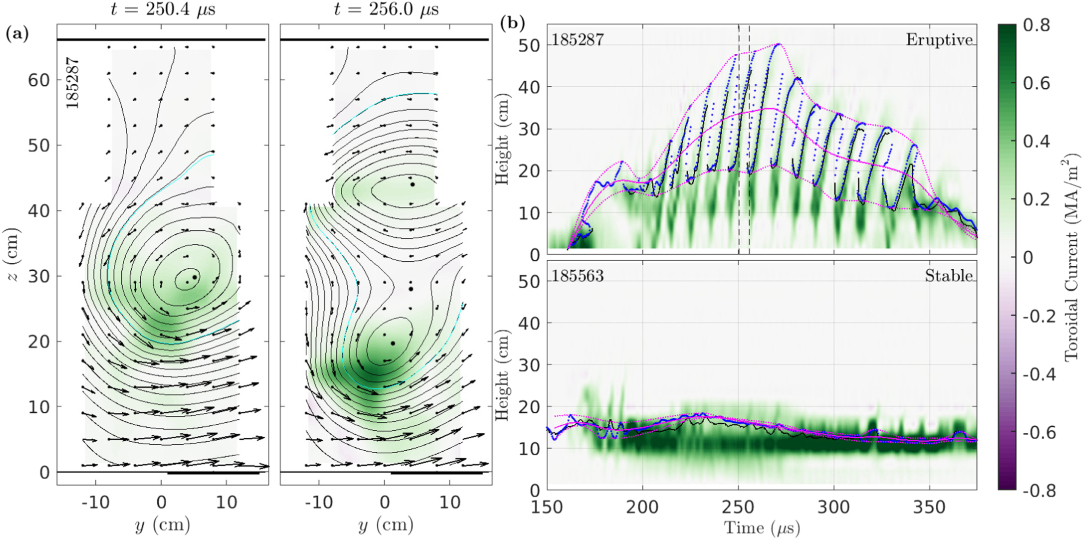 (a) Example cuts of the toroidal current density (in color) at the apex of an eruptive flux rope, with arrows representing the in-plane magnetic field and dots at the nulls of this field. Contours of constant flux are shown with black curves, and the flux contour that contains 80% of the total current is marked in cyan. The first panel is a time when the rope is rising and only a single apex value exists. The second panel is a later time, after a lower rope has formed that will soon erupt while the remaining portion of the initial rope can still be seen. This example event is counted as an eruption. (b) An example of the time evolution of the apex height in an eruptive rope (top) compared with a stable one (bottom). The locations of the apex height are plotted with blue dots, and a filtered height and envelope are plotted in magenta. The peak value of the toroidal current density at each height is also plotted in color. The times shown in panel (a) are marked with dashed lines in the top panel. Near the end of each eruption in the eruptive example, the apex height becomes multivalued as a new rope is formed at a lower height.