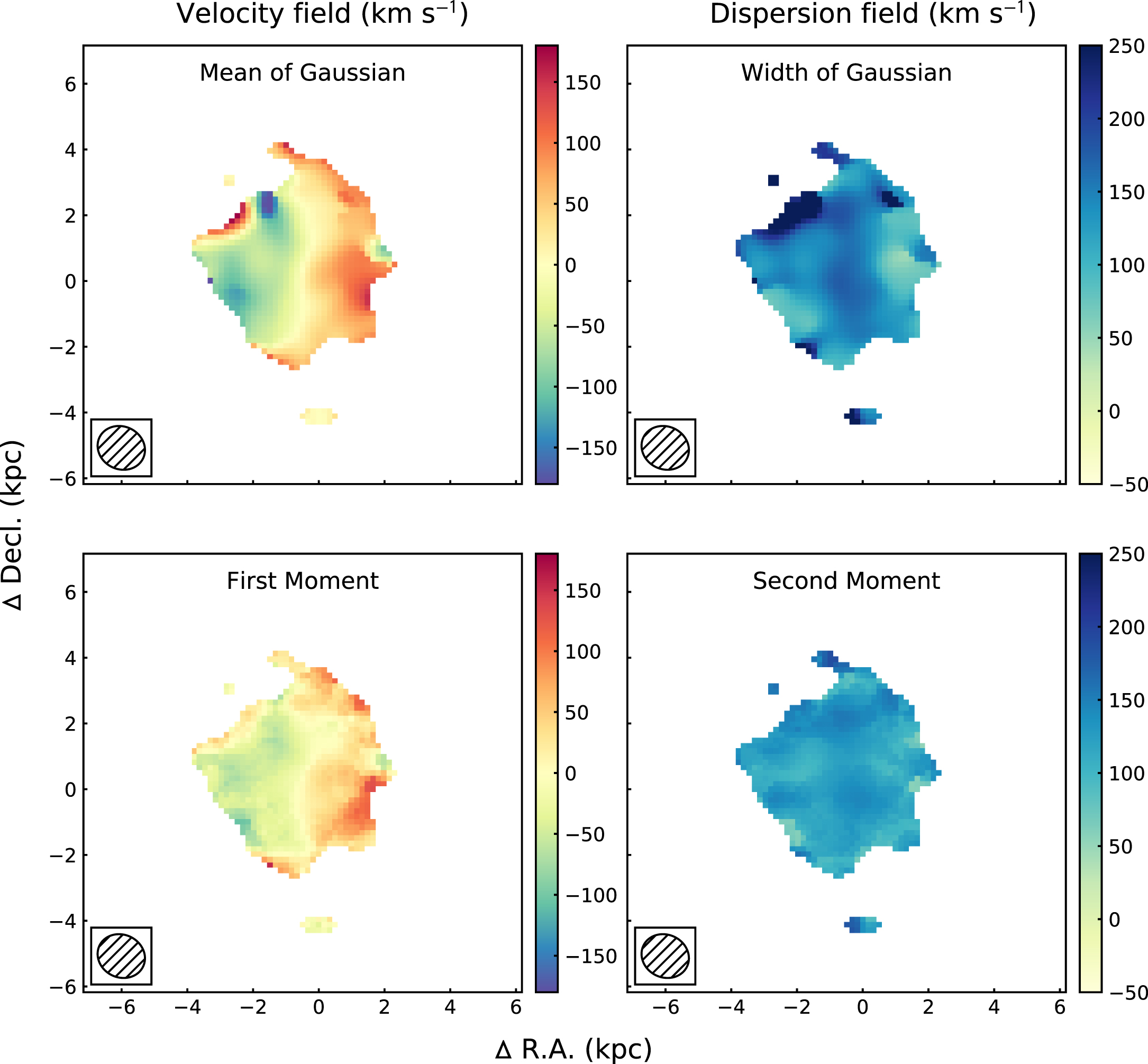 Comparison between the two different methods for generating velocity and dispersion fields for the [C II] emission line from the host galaxy of quasar P183+05. The top row shows the results from fitting a single Gaussian function to the spectrum of each individual spaxel. The data are masked to show only pixels that have been detected at >3σ in the total intensity field. The bottom row is the first moment of the data cube, where the data have been clipped at >1σ. Both methods yield roughly the same velocity and velocity dispersion field. Since the Gaussian fitting routine is independent of the S/N of the data, we opt to use this method in our analysis. The ALMA synthesized beam for these observations is shown in the inset in the lower left corner.
