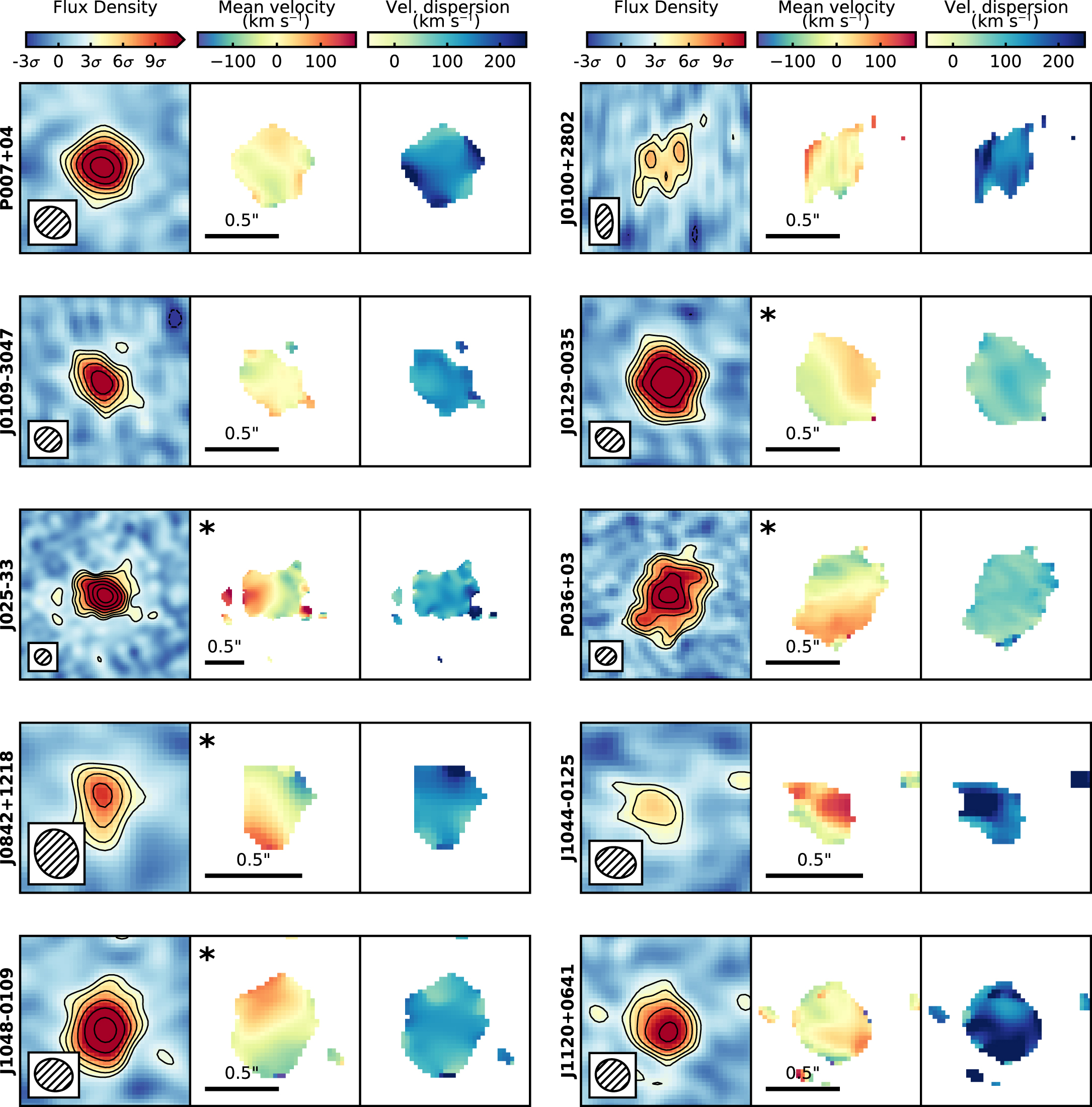 Flux density, mean velocity, and velocity dispersion maps of the 18 quasar host galaxies belonging to the “undisturbed” quasar host sample. The left panel shows the flux density of the [C II] emission line for a channel centered on the [C II] emission with a channel width of 1.2× the FWHM (see Venemans et al. 2020). The ALMA synthesized beam is shown in the inset in the lower left corner, and contours are drawn at 3σ and increase in powers of ﹩\sqrt{2}﹩, with negative contours dashed. The middle panel shows the mean velocity field, where we define the zero velocity to be at the systemic redshift of the [C II] emission, which was determined from the integrated [C II] spectrum (Venemans et al. 2020). The black scale bar shows an angle of 0.″5, which corresponds to a physical distance of about 2.7 kpc at the redshift of the quasar. Quasar host galaxies that show a smooth velocity gradient are marked with an asterisk. The right panel displays the velocity dispersion of [C II] emission. For the latter two columns we only show pixels that have been detected at 3σ in the [C II] flux density map. In all panels north is up and east is to the left.