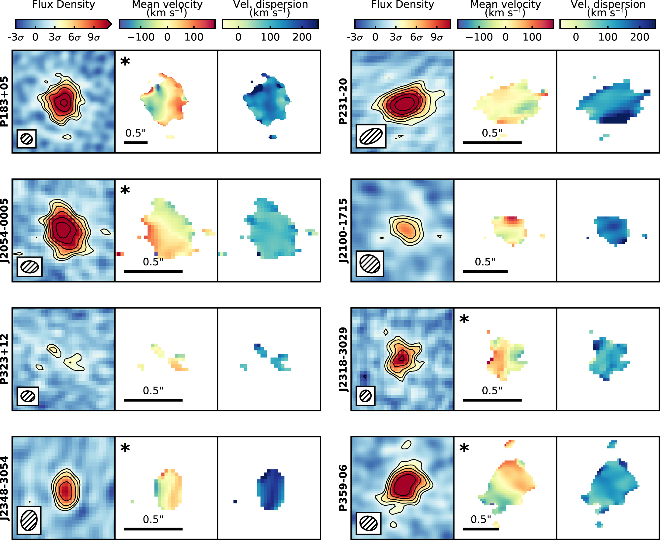 Flux density, mean velocity, and velocity dispersion maps of the 18 quasar host galaxies belonging to the “undisturbed” quasar host sample. The left panel shows the flux density of the [C II] emission line for a channel centered on the [C II] emission with a channel width of 1.2× the FWHM (see Venemans et al. 2020). The ALMA synthesized beam is shown in the inset in the lower left corner, and contours are drawn at 3σ and increase in powers of ﹩\sqrt{2}﹩, with negative contours dashed. The middle panel shows the mean velocity field, where we define the zero velocity to be at the systemic redshift of the [C II] emission, which was determined from the integrated [C II] spectrum (Venemans et al. 2020). The black scale bar shows an angle of 0.″5, which corresponds to a physical distance of about 2.7 kpc at the redshift of the quasar. Quasar host galaxies that show a smooth velocity gradient are marked with an asterisk. The right panel displays the velocity dispersion of [C II] emission. For the latter two columns we only show pixels that have been detected at 3σ in the [C II] flux density map. In all panels north is up and east is to the left.