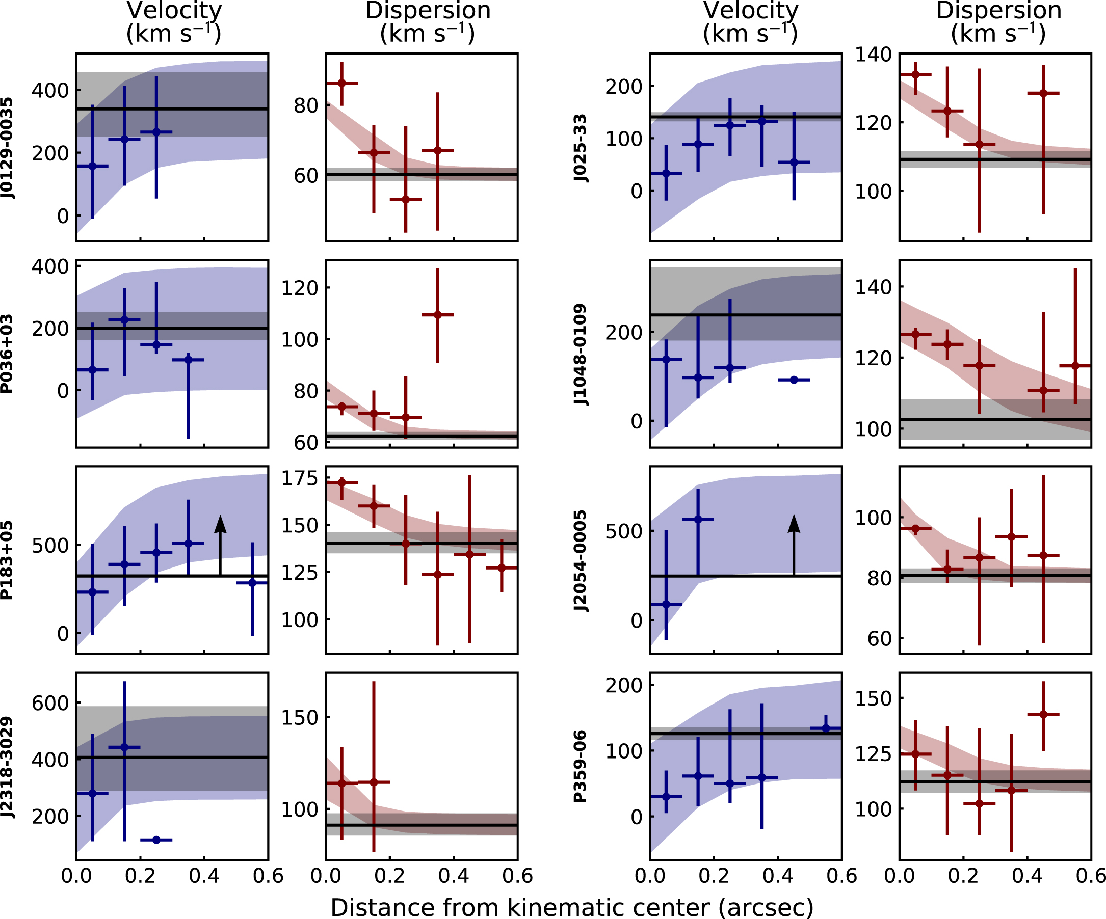 Velocity and dispersion profiles of the eight galaxies that have emission extended over greater than two beams along the major axis, show a clear velocity gradient, and show no evidence of merger activity or nearby companion. The left panel displays the velocity profile for the data with 1σ uncertainties. The blue shaded region marks the 16th to 84th percentile range of the rotational velocity profile as determined from the constant-velocity model convolved with the beam. The black (and gray) shading is the constant rotational velocity (and 1σ uncertainties) as determined from the kinematic modeling. The right panel is similar to the left, except for the velocity dispersion measurements. In all galaxies the agreement between the model and data for both the rotational velocity and velocity dispersion suggests that the assumed constant rotational velocity and velocity dispersion are sufficient at this resolution.