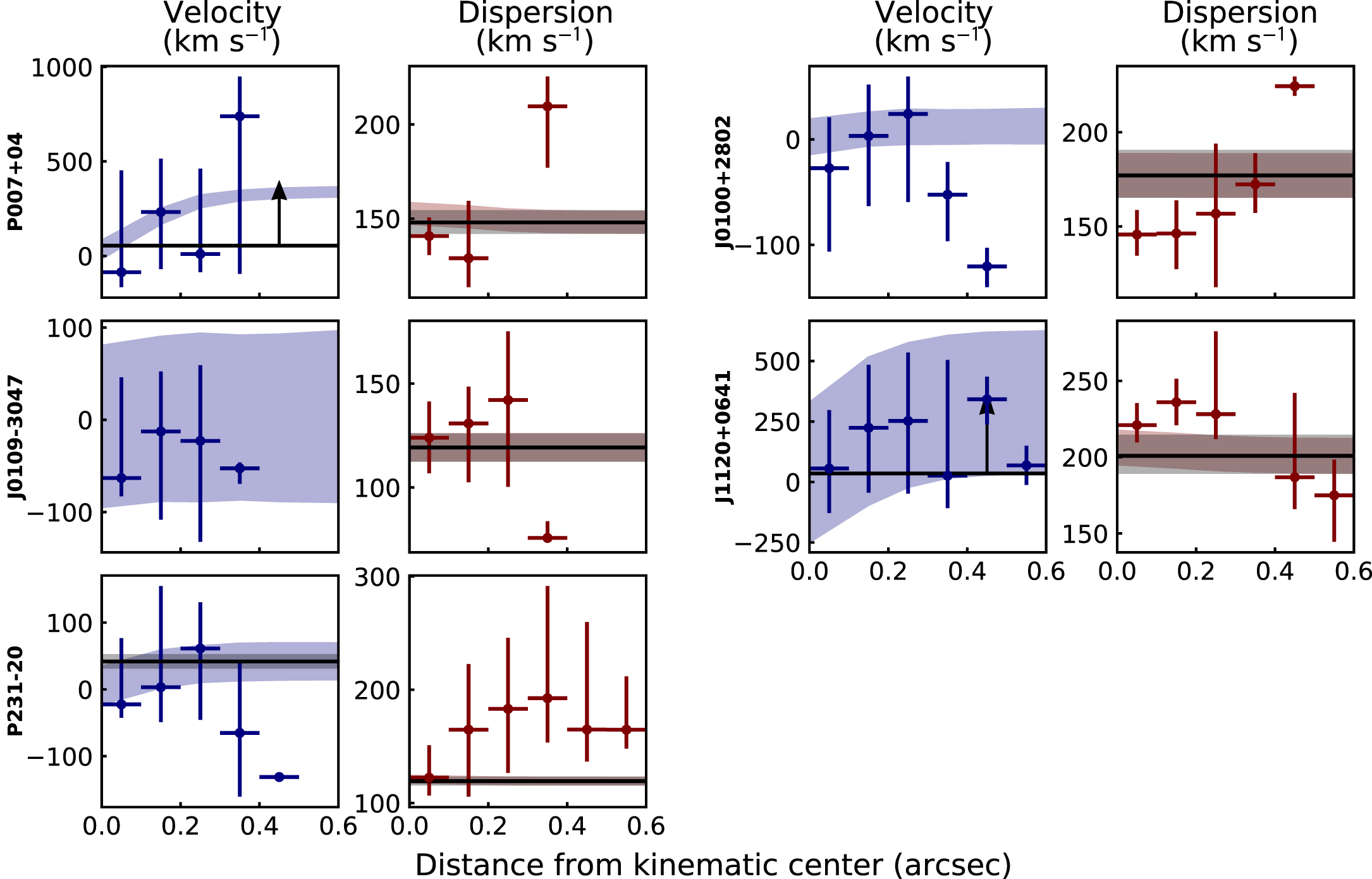 Same as Figure 3, but for the five galaxies that have emission extended over greater than two beams but show no signs of coherent rotation. Here the lack of a rotational gradient implies that the velocity dispersion does not increase in the center owing to the effects of beam smearing. This is observed in both the data and the model, which again indicates that at this resolution the data are well modeled by a velocity dispersion that is constant throughout the [C II]-emitting region.