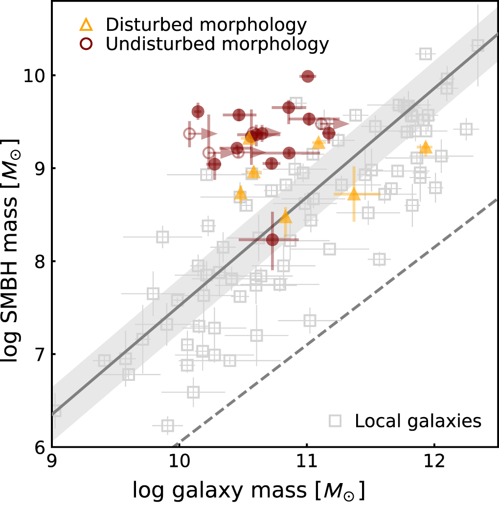 Black hole mass vs. the dynamical mass estimate for the z ≳ 6 quasar sample. Also shown is the black hole mass vs. bulge mass for local galaxies (Kormendy & Ho 2013; de Nicola et al. 2019) on the same axes. The fit to this data from Kormendy & Ho (2013) is shown as a solid line, where the shaded region marks the 1σ scatter seen in the data around this correlation. Also shown is the fit to the total stellar mass vs. black hole mass for local AGNs (dashed line; Reines & Volonteri 2015). The quasar sample is apportioned into two groups based on the [C II] morphology, which are generally observed above the locally derived correlation.