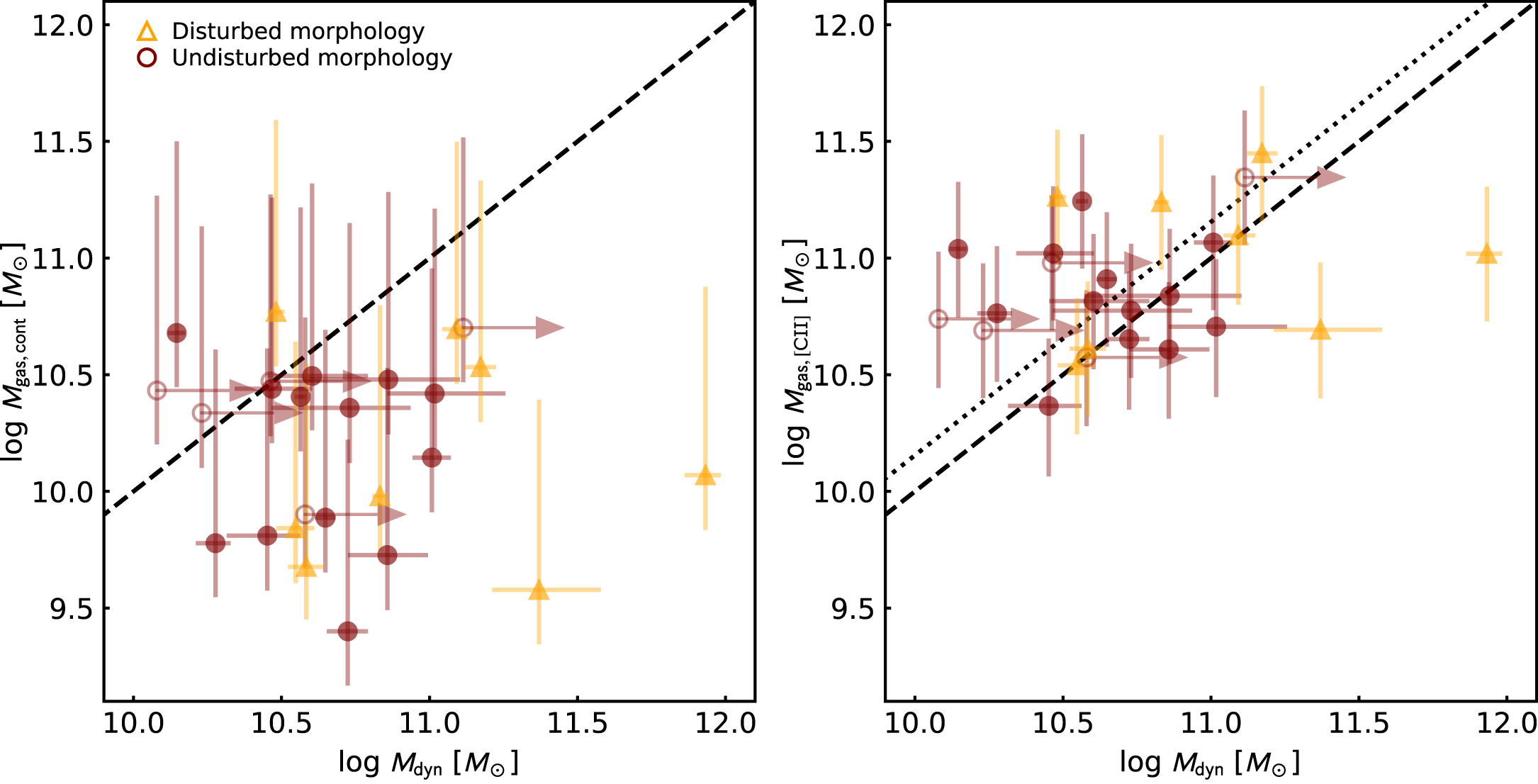 Molecular mass estimates compared to the dynamical mass either from the dust continuum emission (left panel; assuming standard conversion estimates; e.g., Venemans et al. 2016) or from the scaling between [C II] luminosity and molecular mass (right panel; Zanella et al. 2018). In the latter case, the [C II]-based molecular gas mass estimate is unphysically higher than the dynamical mass estimate, suggesting that the scaling relationship derived in Zanella et al. (2018) for main-sequence galaxies at z ∼ 2 does not apply to z ≳ 6 quasar host galaxies. We find that the gas mass estimates derived from the dust continuum are lower than the dynamical mass estimates, as expected, because the dynamical mass accounts for all mass components within the given radius, including the gas.
