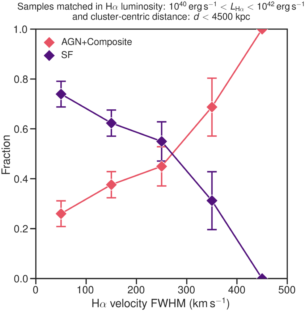 The fraction of AGNs increases, while the fraction of SF decreases with the FWHM velocity of the Hα narrow component.