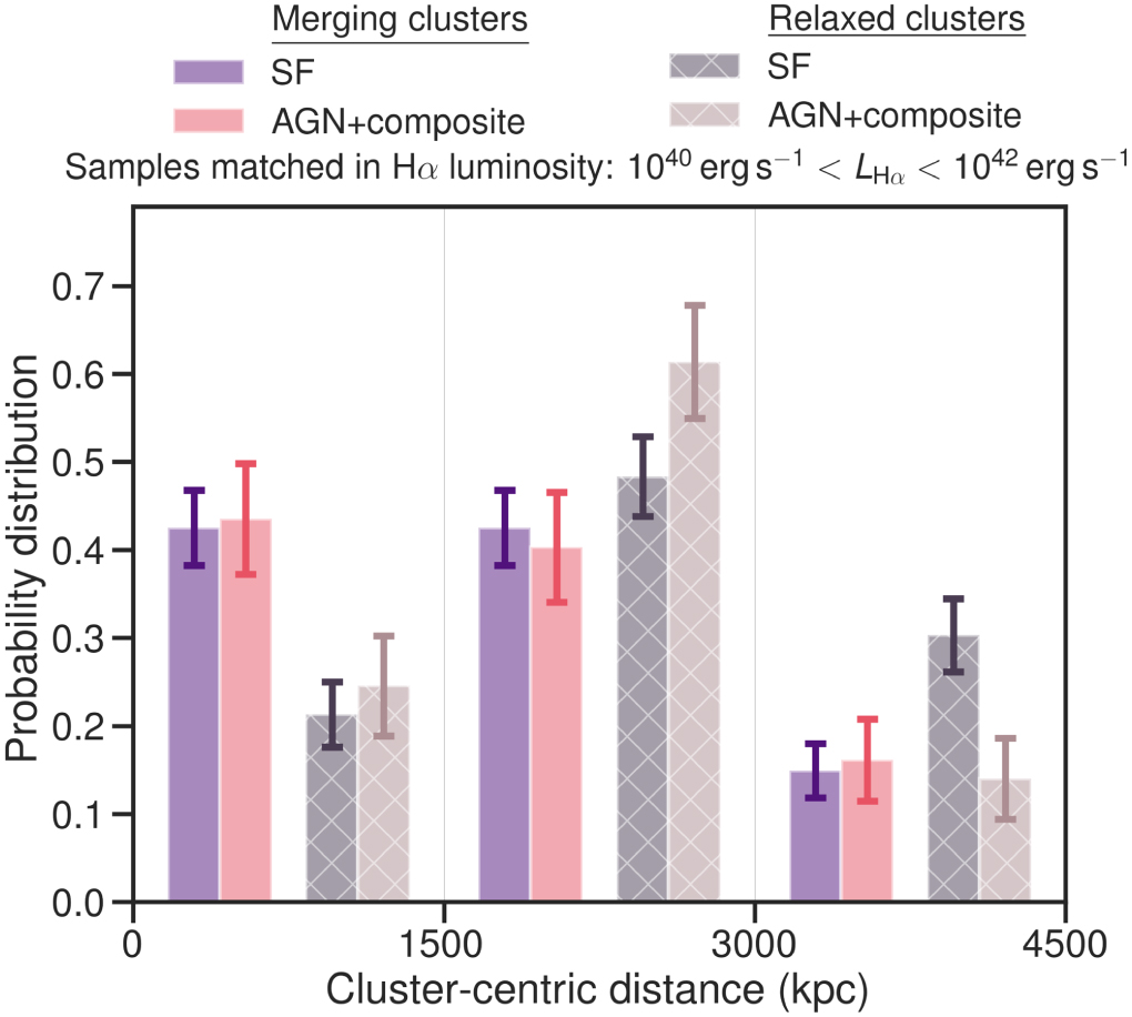 Normalized probability distribution with cluster-centric distance. Only sources with Hα luminosities between 1040 and 1042 erg s−1 are included. We separate sources into four classes, based on their parent cluster type and the powering source of the Hα emission (SF or AGNs). The radial distribution of star-forming galaxies and AGNs is different between relaxed and merging clusters. The bulk of SF and AGN activity in merging clusters is happening within 3 Mpc of the cluster core. By contrast, the bulk of emission-line galaxies in relaxed clusters are located outside the core (>1.5 Mpc).
