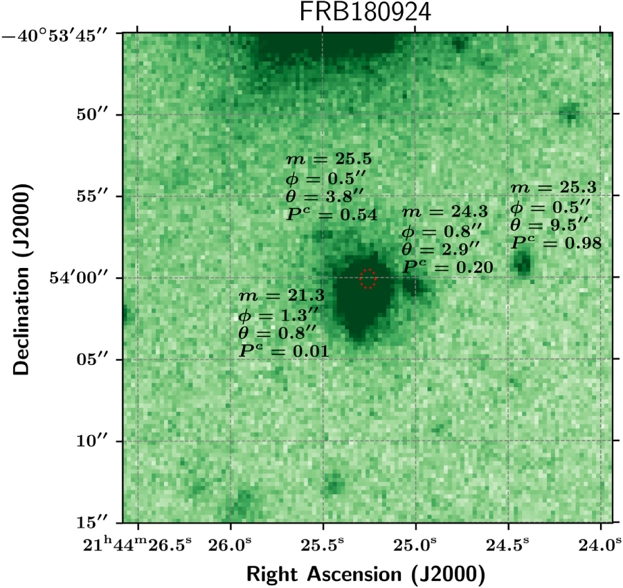 Cutout g-band image (VLT/FORS2) centered on FRB 180924 (small red circle indicates the 5σ localization). There are four extended sources with a separation of θ < 10″ marked as candidates for the host galaxy of the FRB. These are labeled (just above them, except for the brightest) by their θ, angular size ϕ, apparent magnitude m, and the chance probability Pc of an association.