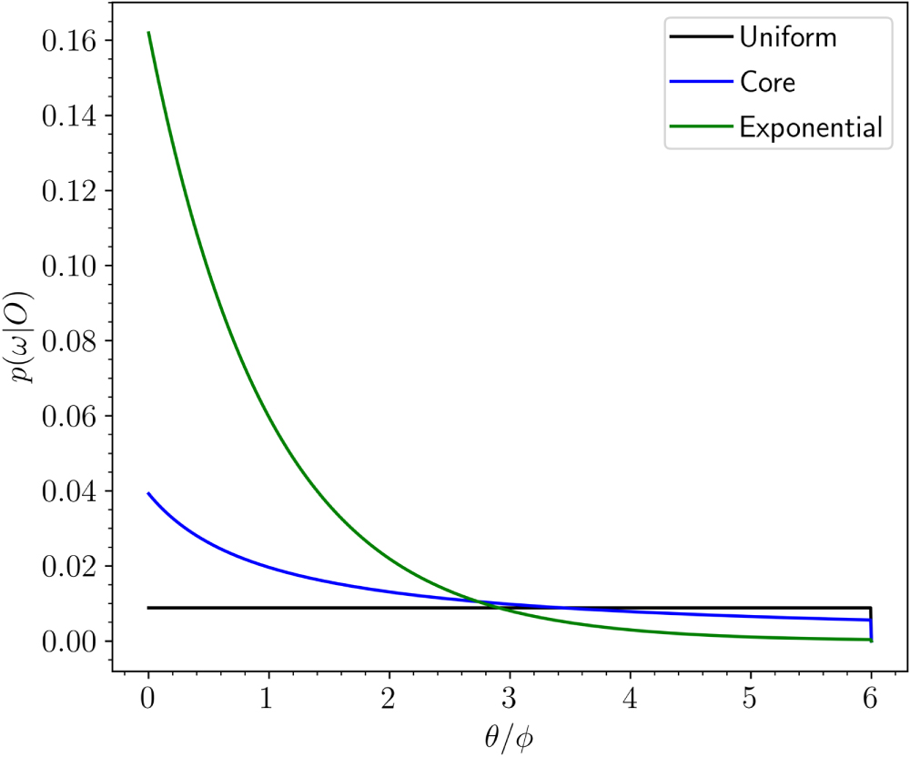Three offset functions p(ω∣Oi) considered for the underlying angular distribution of FRBs relative to their host galaxies, normalized by the galaxy’s half-light radius ϕ. Each is normalized to have identical integrated area to a maximum assumed offset of ﹩{\theta }_{\max }=6\,\phi ﹩.