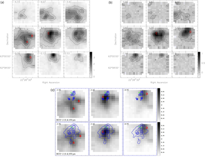 Panel (a): Channel maps of G107.50 + 4.47 HCO+ (1-0) lines from −4.73 km s−1 to 0.53 km s−1. Panel (b): Channel maps of G107.50 + 4.47 H13CO+ (1-0) lines from −4.49 km s−1 to 0.90 km s−1. Panel (c): The 450 μm and 850 μm continuum data from SCUBA-2, superposed on the HCO+ channel maps (velocities are −2.76, −2.10, and −0.79 km s−1, respectively. The green circles denote Class 0/I YSOs from AllWISE data.).