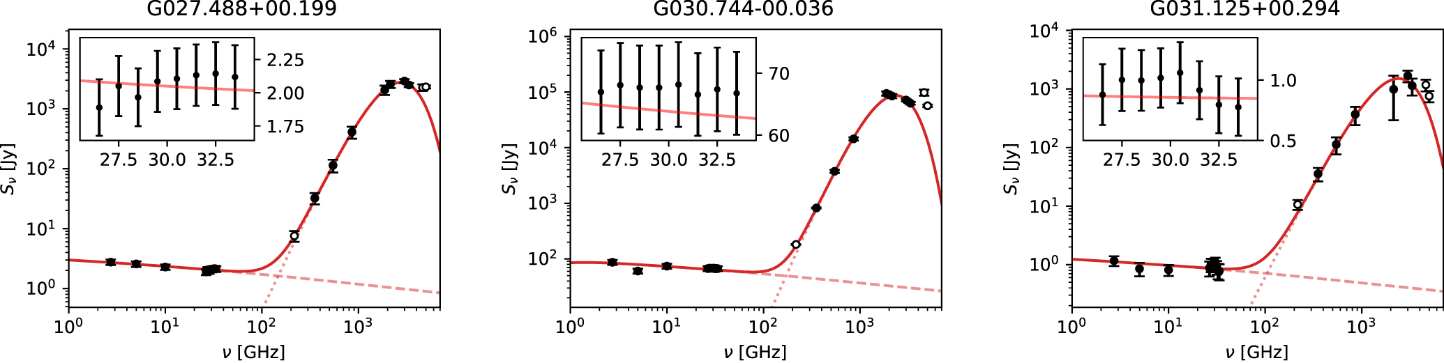 SEDs of three H II regions without an AME detection. Filled circles are used in the fit while open circles are not. The free–free and thermal dust components are shown as dashed and dotted lines, respectively. The total emission model is shown as a thick red line. The inset shown on the upper left of all plots shows the COMAP in-band 26–34 GHz spectrum.