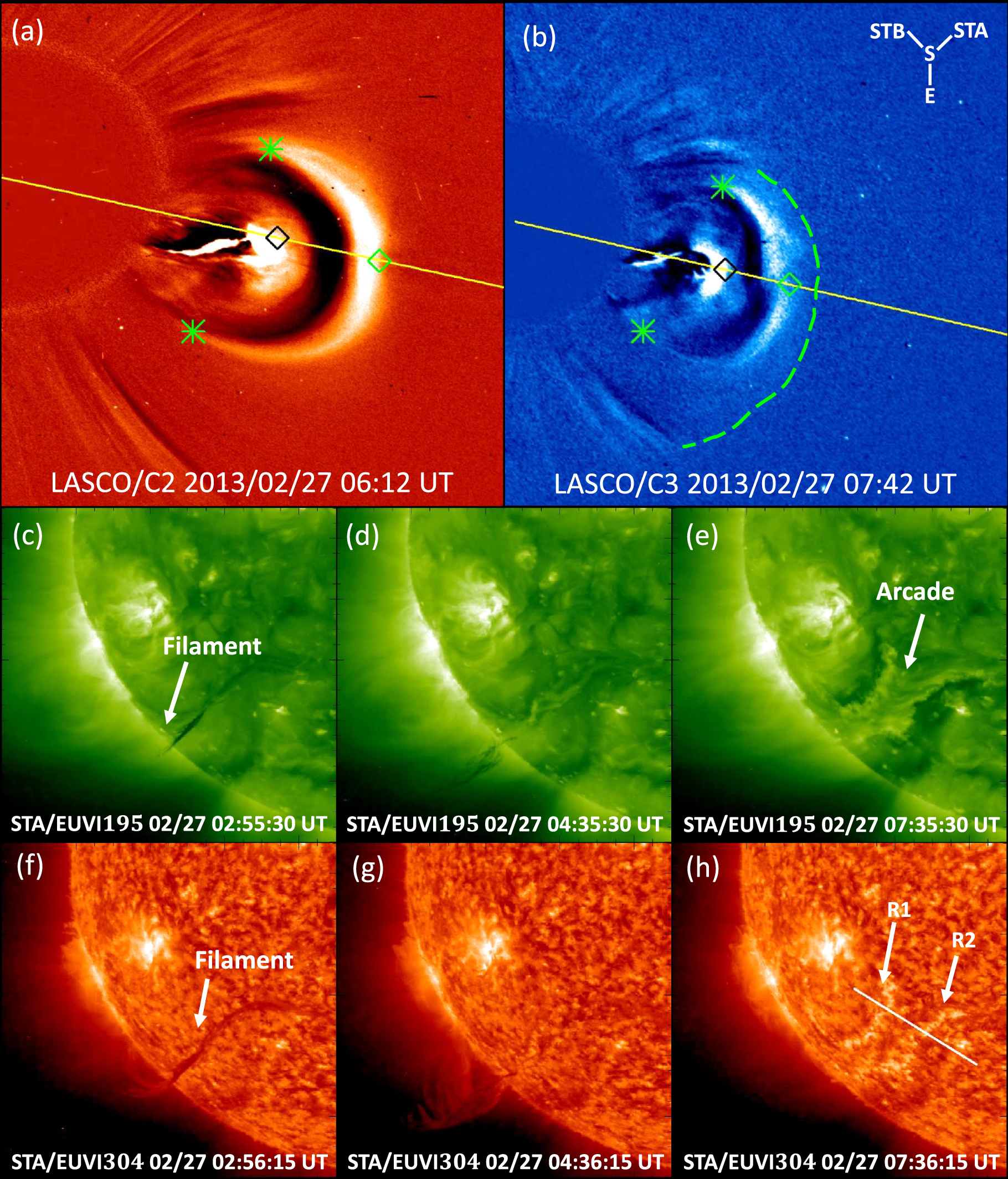 CME eruption on 2013 February 27. (a), (b) Running-difference images of the CME in LASCO C2 and C3 at two different times. The yellow line indicates the position angle used for the height measurement, the black and green diamonds indicate the CME core and front, and the two green asterisks mark the two lateral points. In panel (b), the dashed green curve indicates the shock front, and the inset shows the positions of STEREO-A and STEREO-B relative to the Sun (S) and Earth (E). Panels (a) and (b) show heliocentric distance ranges of 1–6 R ⊙ and 1–17 R ⊙, respectively. (c)–(h) Observations of STEREO-A/EUVI at 195 ﹩\mathring{{\rm{A}}}﹩ and 304 ﹩\mathring{{\rm{A}}}﹩. The solid line in panel (h) refers to the position of the superposed slit.