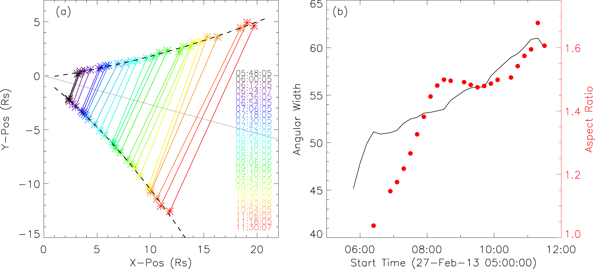 (a) Variation of the lateral width of the CME at different times in the X–Y plane. The black solid line indicates the position angle of 255°, and the two curves show the quadratic fit to the X–Y data points. (b) Variation of the angular width of the CME (black) and the aspect ratio (red).