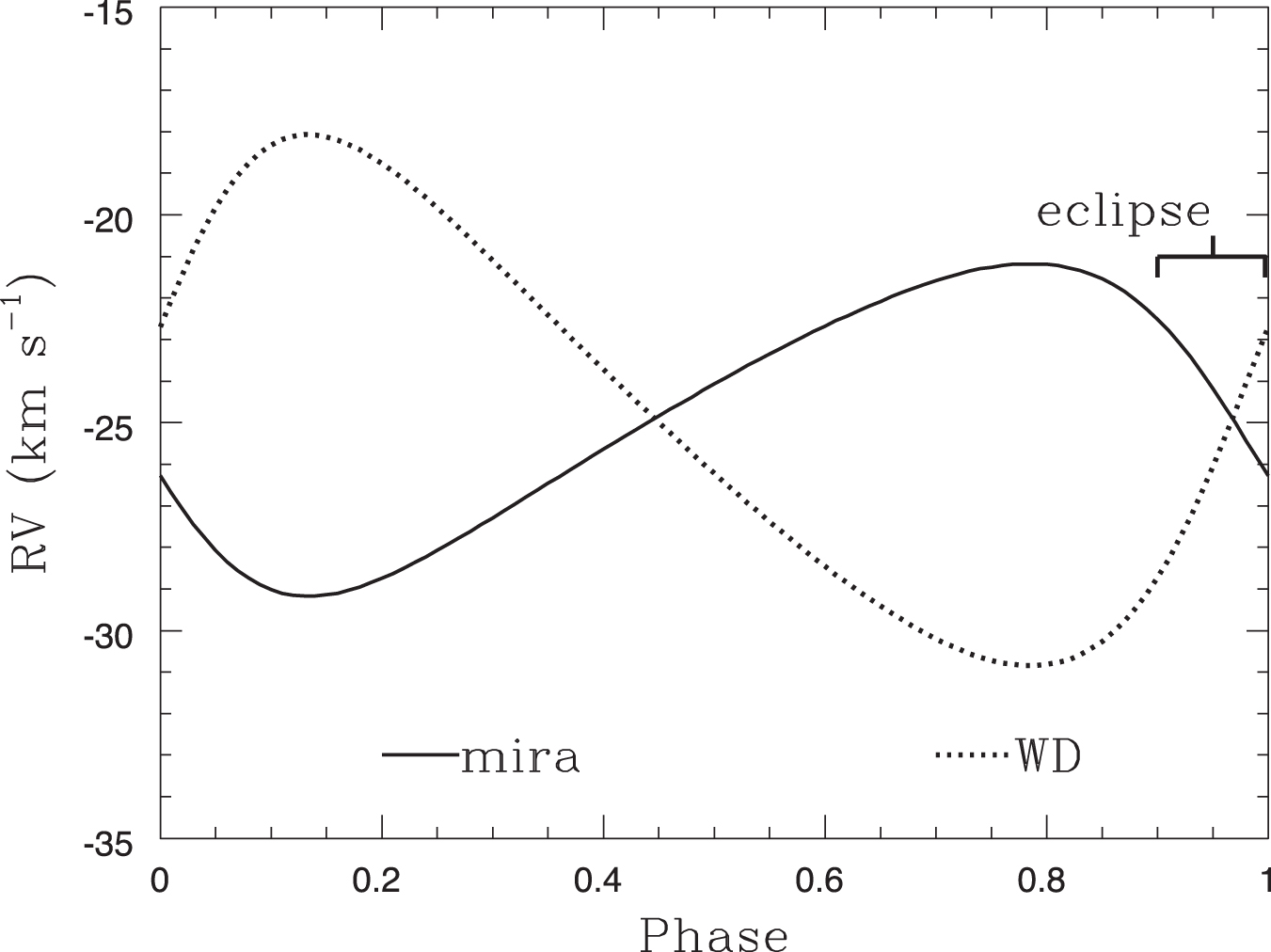 Radial velocity as a function of orbital phase for the R Aqr Mira and WD from the orbital elements of Gromadzki & Mikołajewska (2009). The WD orbit, which is not observed, assumes the ratio of the Mira to WD mass is 1.6. Zero phase is a time of periastron passage. A disk eclipse of duration one-tenth the orbital period, 4.4 yr, is marked. The characteristics of the eclipse are not well known. Ingress and egress times could differ significantly from those shown.