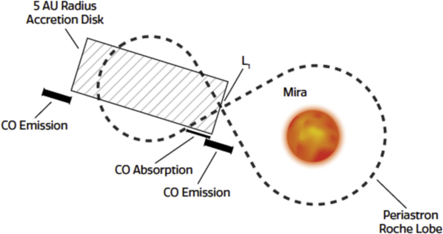Graphic of the R Aqr system near mid-eclipse viewed from the side. The system is inclined 18° to the line of sight. The hatched rectangle is the nominal 5 au radius accretion disk with h/r = 0.2. The orange disk labeled “Mira” illustrates the approximate 2 au radius of the Mira’s IR photosphere. The approximate shape of the Roche potential is illustrated using the Eggleton (1983) radius (heavy dashed line). The potential is shown extended to the inner Lagrange point, L1. The Roche radius of the Mira at periastron is ∼4.9 au and of the WD ∼4.0 au. L1 is ∼6.4 au from the center of the Mira (Plavec & Kratochvil 1964) and the Mira is clearly detached. Eclipse is near periastron when the WD Roche lobe is smaller than the nominal accretion disk. At apastron the WD Roche radius is ∼6.6 au. The approximate regions observed in CO emission and absorption are marked.