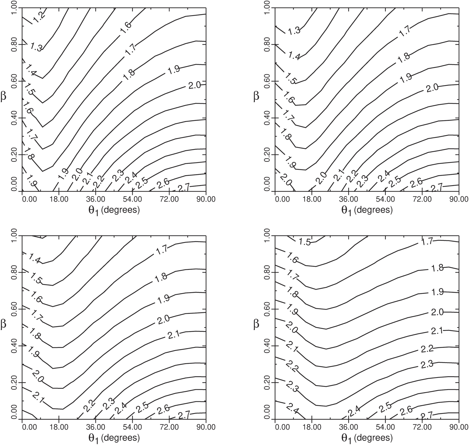 Contour plots of the first critical fast Mach number in the plasma β - θ 1 plane for ﹩{E}_{\mathrm{CR}}/{\rho }_{1}{v}_{1| | }^{2}=0.025﹩, 0.05, 0.1, and 0.2 are shown in the top left, top right, bottom left, and bottom right panels, respectively.