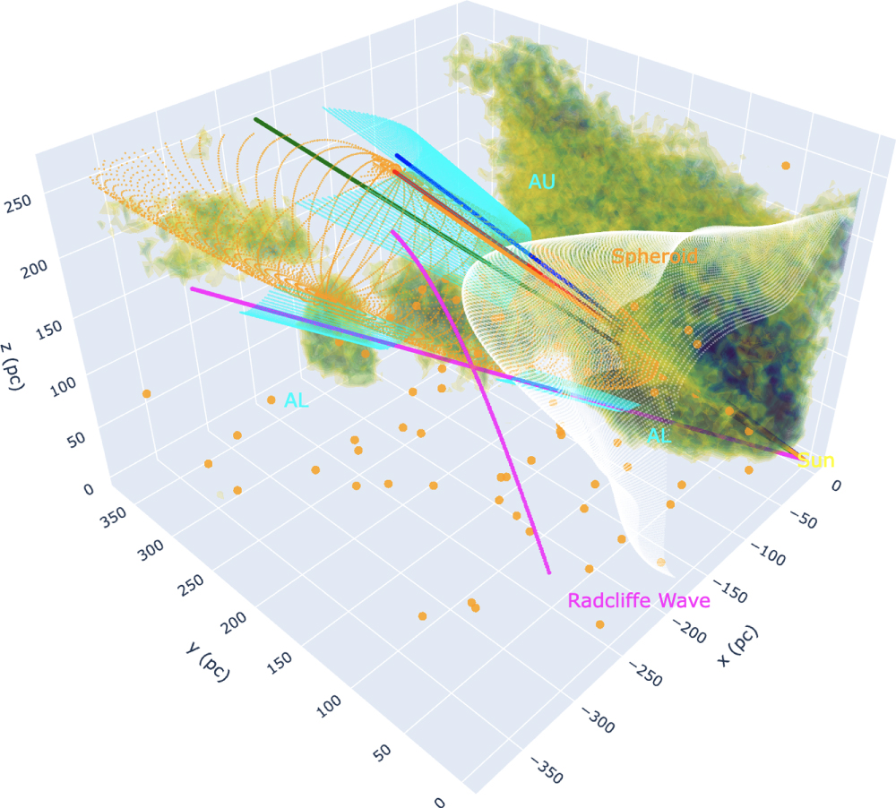 Interactive volume rendering of s x from L20 in the second quadrant above the Galactic plane, as in Figure 7 but highlighting low-density gas (see text). Annotations follow Figure 7. In addition, orange dots show the xyz positions of OB stars in this volume from Pantaleoni Gonzalez et al. (2021) (Section 4.3).