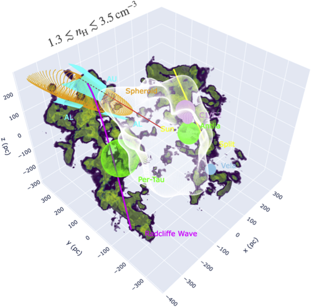 Interactive volume renderings of s x from the entire L20 3D cube, highlighting gas in the limited range of density 1.3 ≲ n H (cm−3) ≲ 3.5 (logarithmic form, see text). For orientation, the path for the extinction density profile toward DF is shown by the red solid line. The white drapery pattern represents the inner surface of the LB (P20). The magenta locus and yellow line show the positions of the best-fit model of the Radcliffe wave (Alves et al. 2020) and the Split (Lallement et al. 2019; Zucker et al. 2022), respectively. The orange spheroid shows an idealized model of the cavity associated with the NCPL. The large green sphere shows the Per-Tau shell (Bialy et al. 2021). The two plum spheres show the H I shells from Bracco et al. (2020). The small green sphere shows the surface of the Antlia supernova remnant (SNR) (Tetzlaff et al. 2013; Jung et al. 2021). The small blue sphere shows the Vela SNR (Dodson et al. 2003).