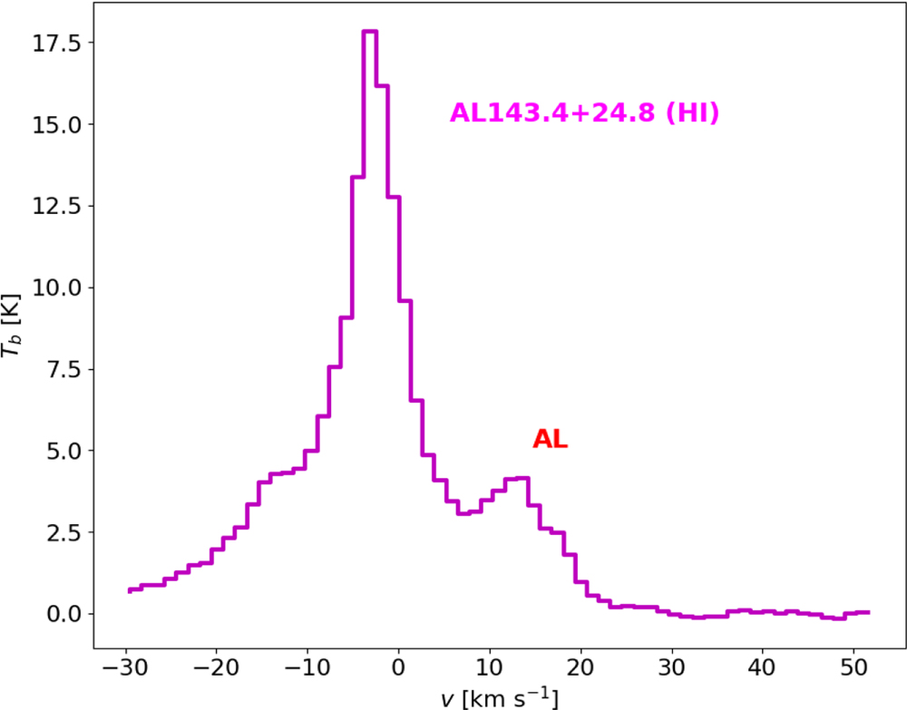 Brightness temperature profile along AL at (143.°4, 24.°8) extracted from the NCPL mosaic in the GHIGLS survey. The emission at positive velocities corresponds to the AL arc seen in the brightness temperature map at v = 16.85 km s−1 shown in the top panel of Figure 1.