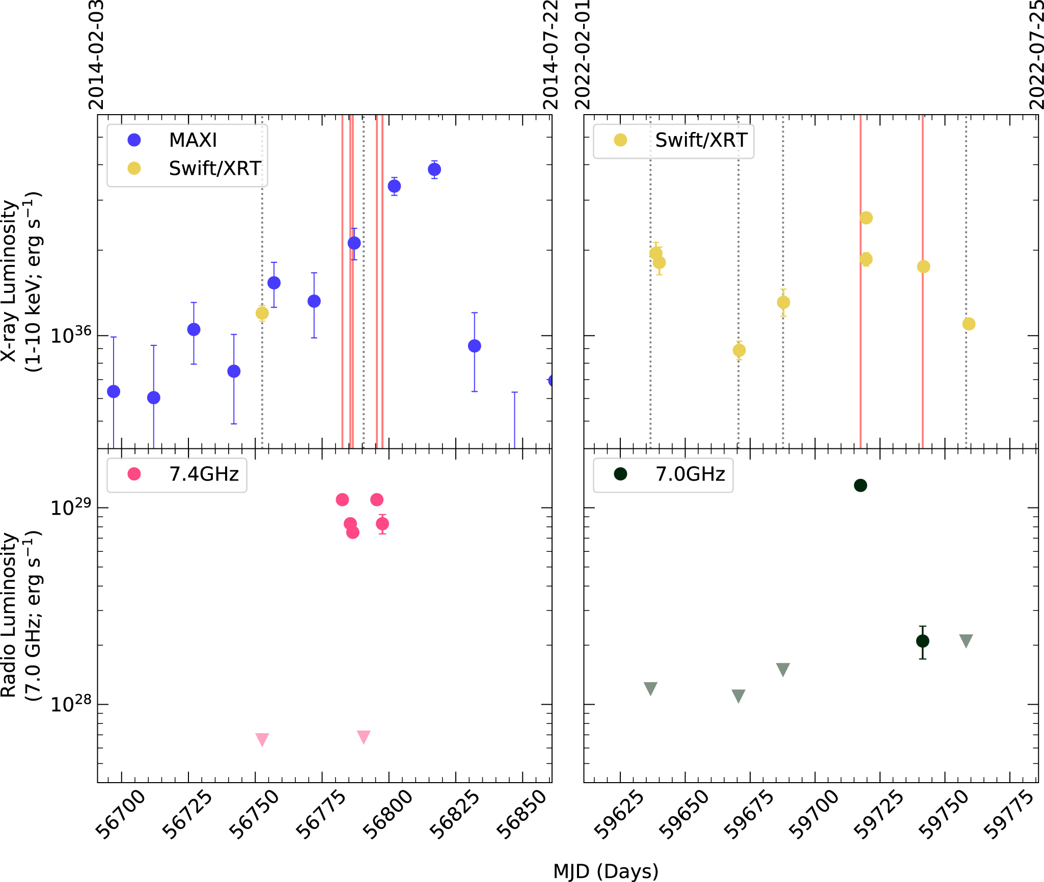 2014 (left panel) and 2022 (right panel) radio and X-ray light curves for X1850–087 (see also Panurach et al. 2021). The top row shows X-ray light curves from MAXI (blue) and Swift/XRT (yellow), all plotted as 1–10 keV luminosities. The bottom row shows 7.4 (left in pink; from 2014) and 7.0 GHz (right in black; from 2022) VLA radio luminosity light curves. Filled circles represent detections while upside down triangles are 3σ upper limits. Solid salmon vertical lines in the top row represent radio detections, while gray dotted lines represent non-detections.