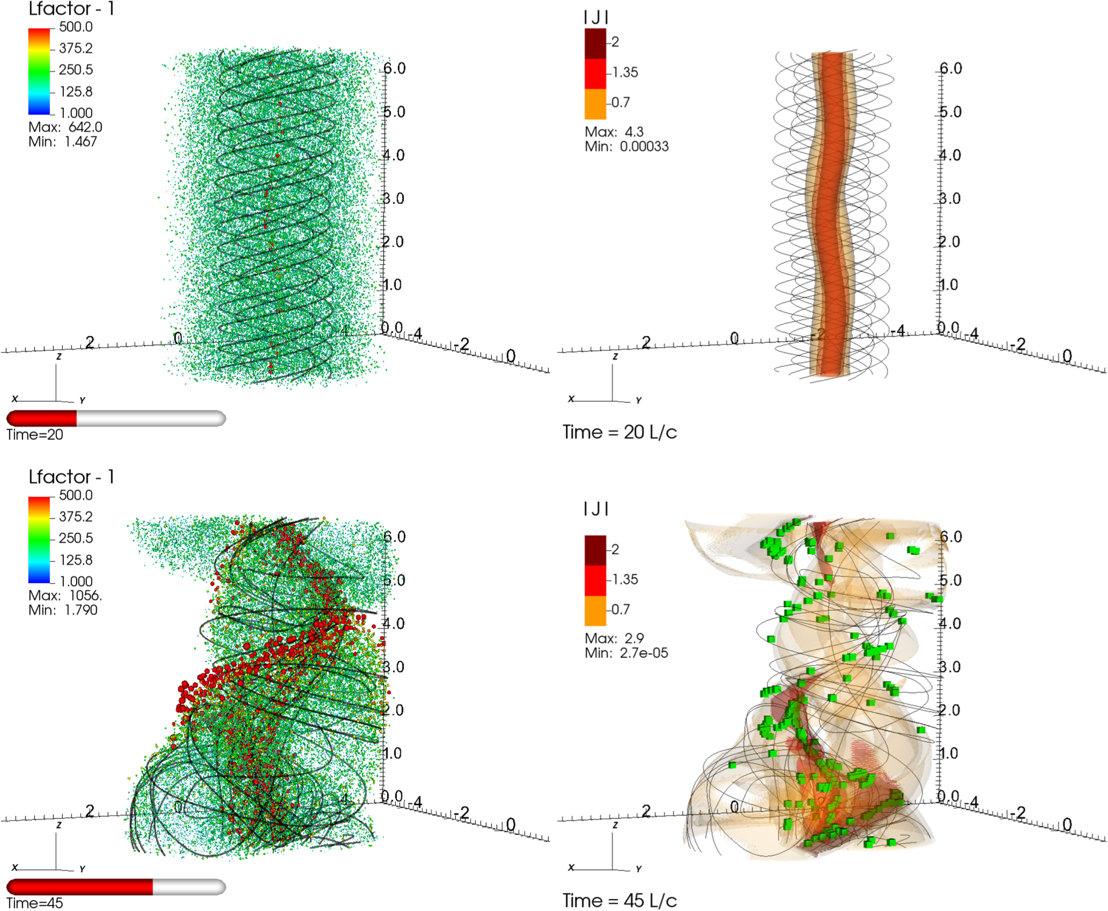 A 3D view of the σ ∼ 1 jet evolved with the MHD-PIC mode at t = 20 (top), and 45 L/c (bottom). Left panels: the black lines represent the magnetic field, and the circles the 50,000 particle distribution. The color and size of the circles indicate the value of their kinetic energy normalized by the rest mass energy (γ p − 1). Right panels: the orange color represents isosurfaces of half of the maximum of the current density intensity ∣J∣, the black lines the magnetic field, and the green squares correspond to the positions of the fastest magnetic reconnection events, with reconnection rate ≥0.05. See the text for more details.