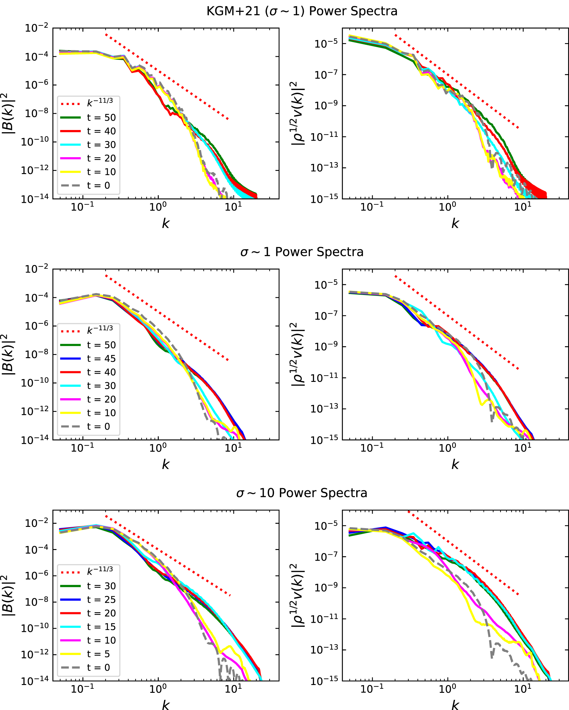 Power spectrum of the magnetic (left) and kinetic (right) energy densities for the σ ∼ 1 jet model of KGM+21 (upper row), the σ ∼ 1 (middle row), and σ ∼ 10 (bottom row) jet models of this work, for different times in units of L/c. The red dotted line corresponds to a k −11/3 3D Kolmogorov spectrum and its extension gives the inertial range of the turbulence for evolved times >30 L/c for the σ ∼ 1 models, and >10 L/c for the σ ∼ 10 model. The wavenumber is in the unit of L.