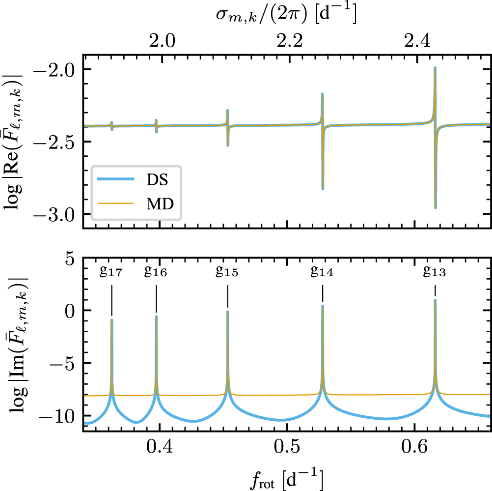 Normalized response function ﹩{\bar{F}}_{{\ell },m,k}﹩ plotted against stellar rotation frequency f rot for the {ℓ, m, k} = {2, −2, 50} partial tide of the KOI-54 primary model. The real (imaginary) part of the function is shown in the upper (lower) panel, and separate curves are plotted for the DS and MD approaches. Peaks are labeled by the resonant mode's classification within the Eckart–Osaki–Scuflaire scheme. The upper axis scale shows the tidal forcing angular frequency σ m,k (Equation (7)).