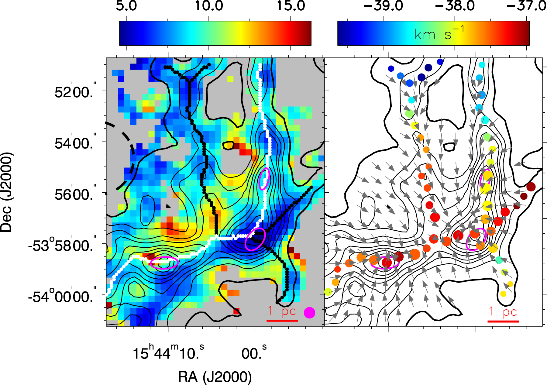 Left: maps of the 13CO/C18O abundance ratio obtained from the 13CO and C18O J = 2–1 lines assuming LTE. Contours are the H2 column density in levels of (0.9, 1.1, 1.3, 1.5, 1.9, 2.4, 3.0, 4.0, and 5.0) × 1022 cm−2. Magenta ellipses mark the dust clumps. Part of the black dashed circle indicates the infrared bubble MWP1G326725+007745. The main and branched skeletons are shown as white and black curves, respectively. The beam size of the CO observation is shown in the lower right corner. Magenta ellipses mark the dust clumps. Right: projected local gravitational field (gray arrows) overlaid on the H2 column density contours in levels of (0.9, 1.1, 1.3, 1.5, 1.9, 2.4, 3.0, 4.0, and 5.0) × 1022 cm−2 and the color-coded velocity centroids of C18O (J = 2–1). The sizes of the symbols indicate the line width of C18O (J = 2–1). The gravitational force vectors are displayed with uniform lengths to emphasize their directions.