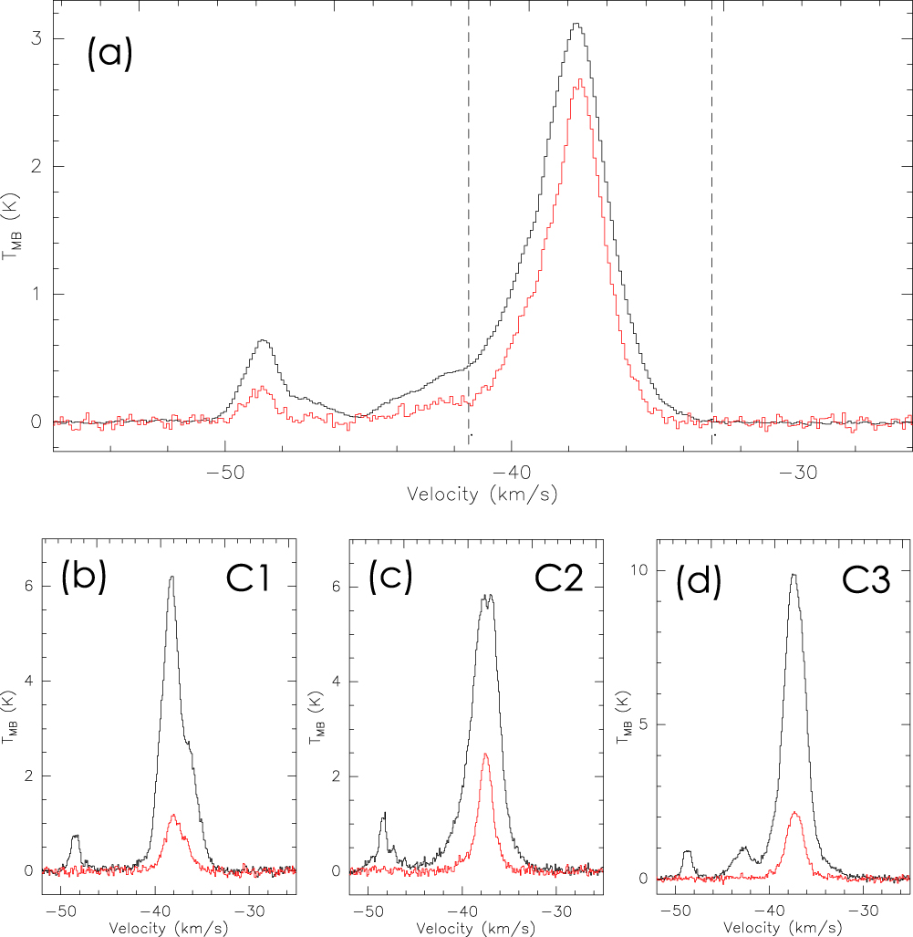(a) Averaged spectra of 13CO (J = 2–1) (black) and C18O (J = 2–1) (red) over the hub–filament cloud of G326. The intensity of C18O (J = 2–1) has been reduced by a scale factor of 5 for ease of viewing. The vertical dashed lines show the velocity interval −41.5 to −33.0 km s−1 over which the infrared dark hub–filament cloud of G326 extends. (b) Beam-averaged spectra of 13CO (J = 2–1) (black) and C18O (J = 2–1) (red) for C1. (c) Same as panel (b), but for C2. (d) Same as panel (b), but for C3.