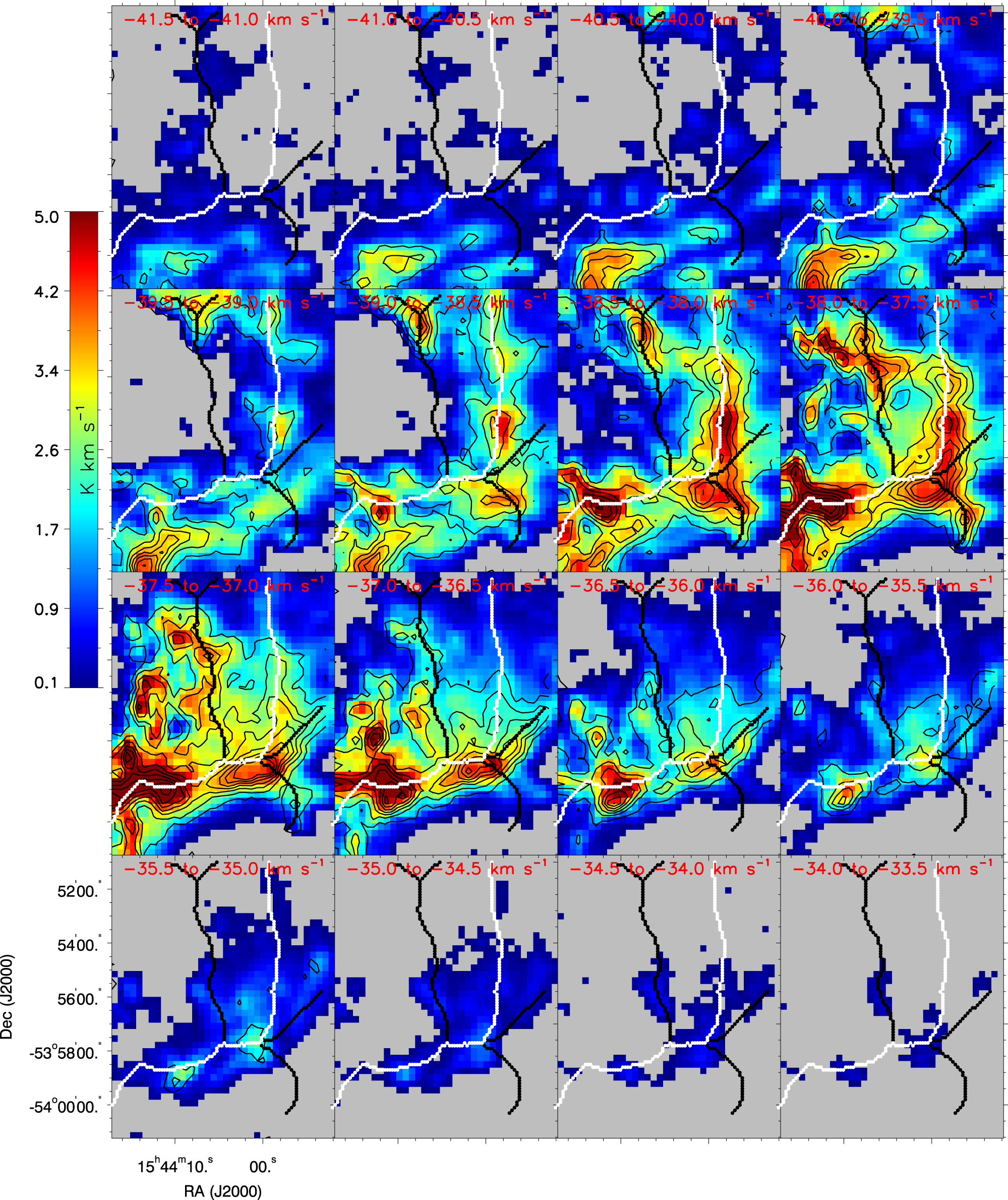 Channel maps of the 13CO (J = 2–1) and C18O (J = 2–1) lines, showing a 13CO (J = 2–1) integrated intensity map (start from 6σ) with C18O (J = 2–1) integrated intensity overlaid as contours. The contours start from 6σ to the peak value with steps of 8σ. The σ of the integrated intensity for both CO isotopologues in the interval velocity range of 0.5 is 0.018 K km s−1. This value is calculated as ﹩{T}_{\mathrm{rms}}\times \sqrt{{N}_{\mathrm{channels}}}\times \delta V﹩, where T rms = 0.08 K represents the typical rms value of the molecular line observations, N channels = 5 denotes the total number of line channels, and δ V = 0.1 km s−1 stands for the velocity resolution. The main and branched skeletons are shown as white and black curves, respectively.