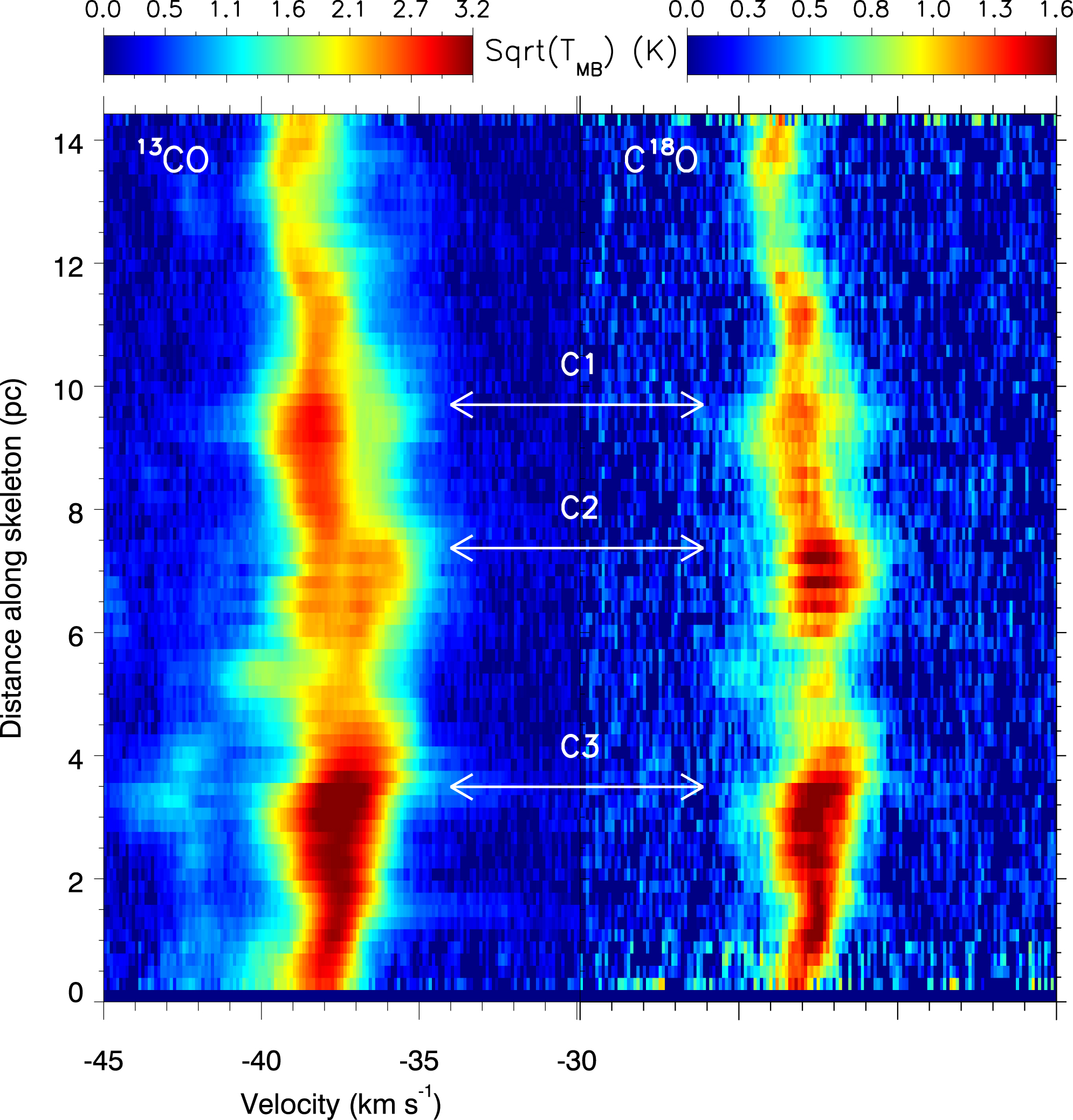 Left: 13CO position–velocity diagram as a function of the distance along the main skeleton (see Figure 5) from the southern to northern end. The color scale is displayed after taking the square root. The white arrows represent the positions of C1, C2, and C3. Right: same as the left panel, but for C18O.
