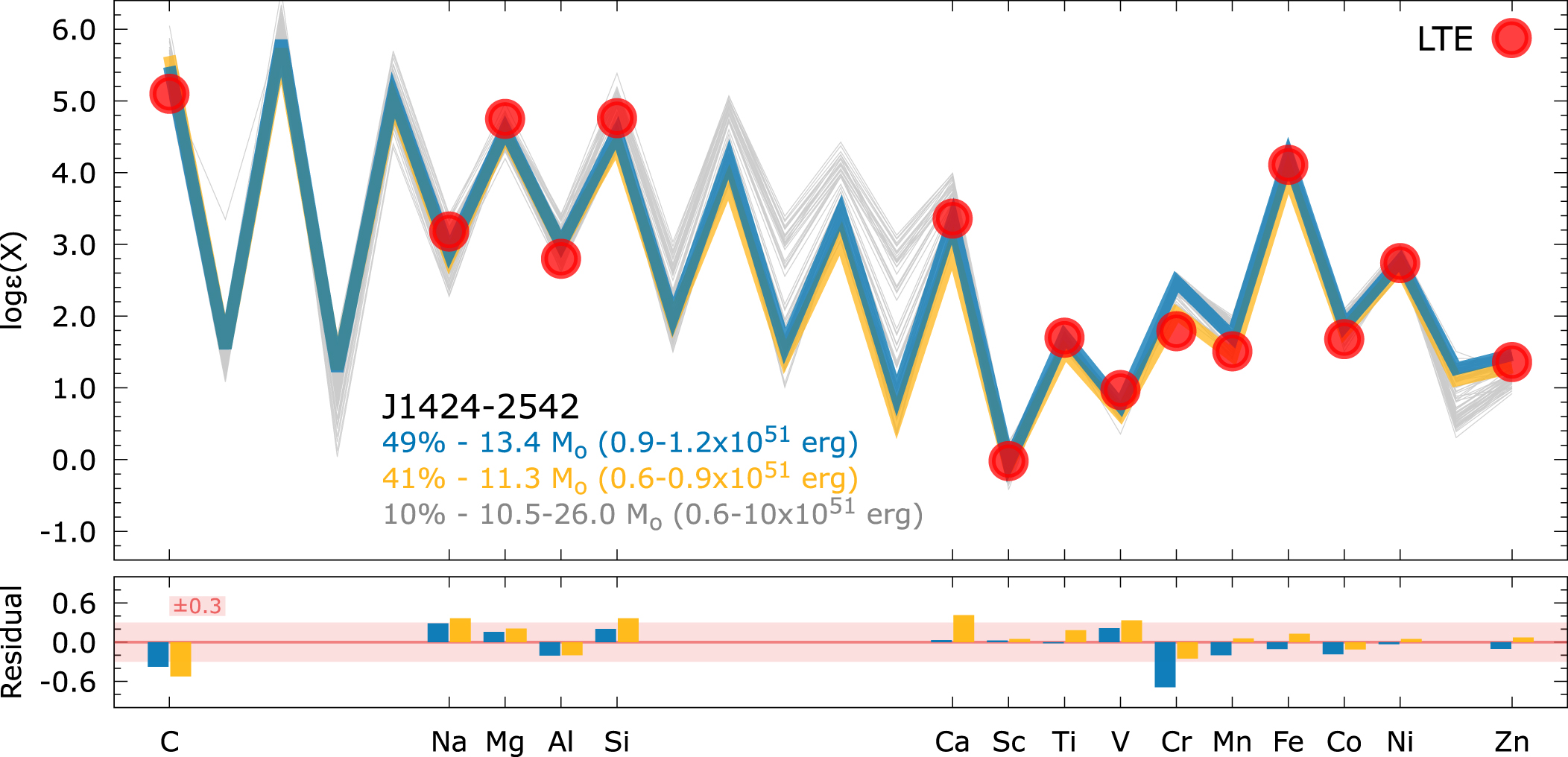 Upper panel: light-element chemical abundance pattern of SPLUS J1424−2542, (filled circles, LTE) compared with the yields from metal-free supernova models (solid lines). The labels show the progenitor mass and explosion energy of the models and their percentage occurrence among the 10,000 abundance pattern resamples of SPLUS J1424−2542. Lower panel: residuals between the observations and the two best-fit models. A ±0.3 dex shaded area is shown for reference.