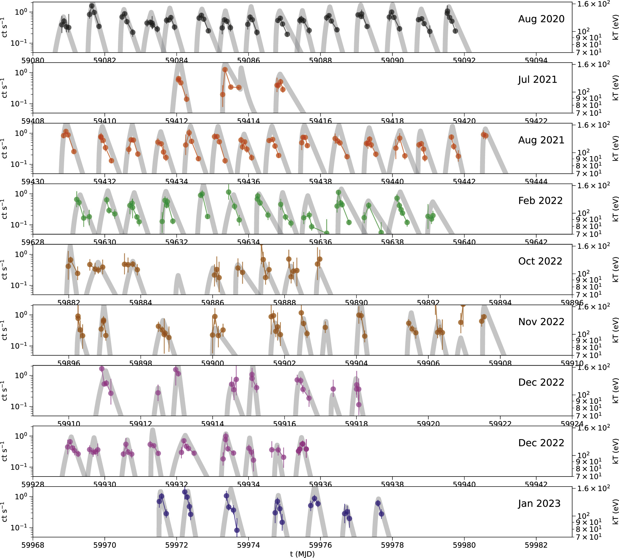 Evolution of blackbody temperature (kT) for all QPEs, plotted separately.