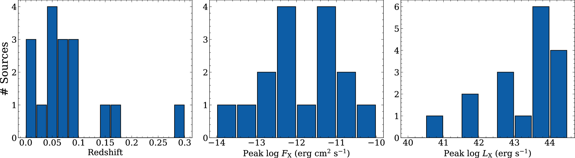 Histogram of the distributions of the properties of our main sample. Redshift (z; left), neutral absorption-corrected peak 0.3–10 keV X-ray flux (F X; middle), and neutral absorption-corrected peak 0.3–10 keV X-ray luminosity (L X; right).