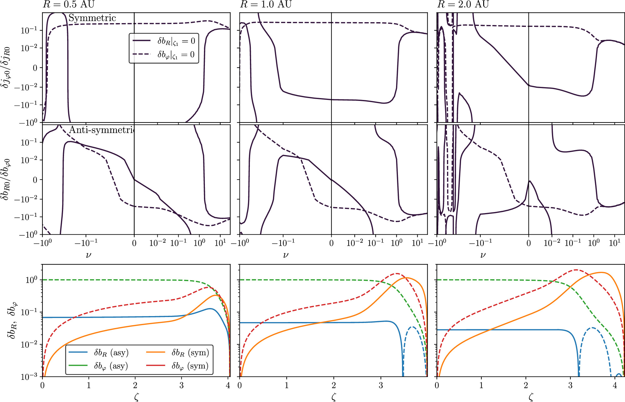 Eigensolutions at disk radii (R/au) ∈ {0.5, 1, 2} presented in different columns (see also Section 4.2.1). The top row shows the phase diagrams for the symmetric perturbation modes in the space spanned by the dimensionless {ν sym} × {δ j φ0/δ j R0}. The solid and dashed contours indicate the tracks of ﹩\delta {b}_{R}{| }_{{\zeta }_{1}}=0﹩ and ﹩\delta {b}_{\varphi }{| }_{{\zeta }_{1}}=0﹩ (ζ 1 is the altitude of the wind base), respectively, and their intersections indicate eigensolutions. Note that the negative-ν and positive-ν regions, separated by a vertical solid line, have different scales in ν. The middle row is similar to the top row but shows the phase diagrams for the antisymmetric modes in the {ν asy} × {δ b R0/δ b φ 0} phase space. The bottom row presents the eigensolutions with the largest growth rates for both modes. Note that the symmetric modes always have negative growth rates, and that the tracks seem to converge at large positive ν but they never actually cross each other.