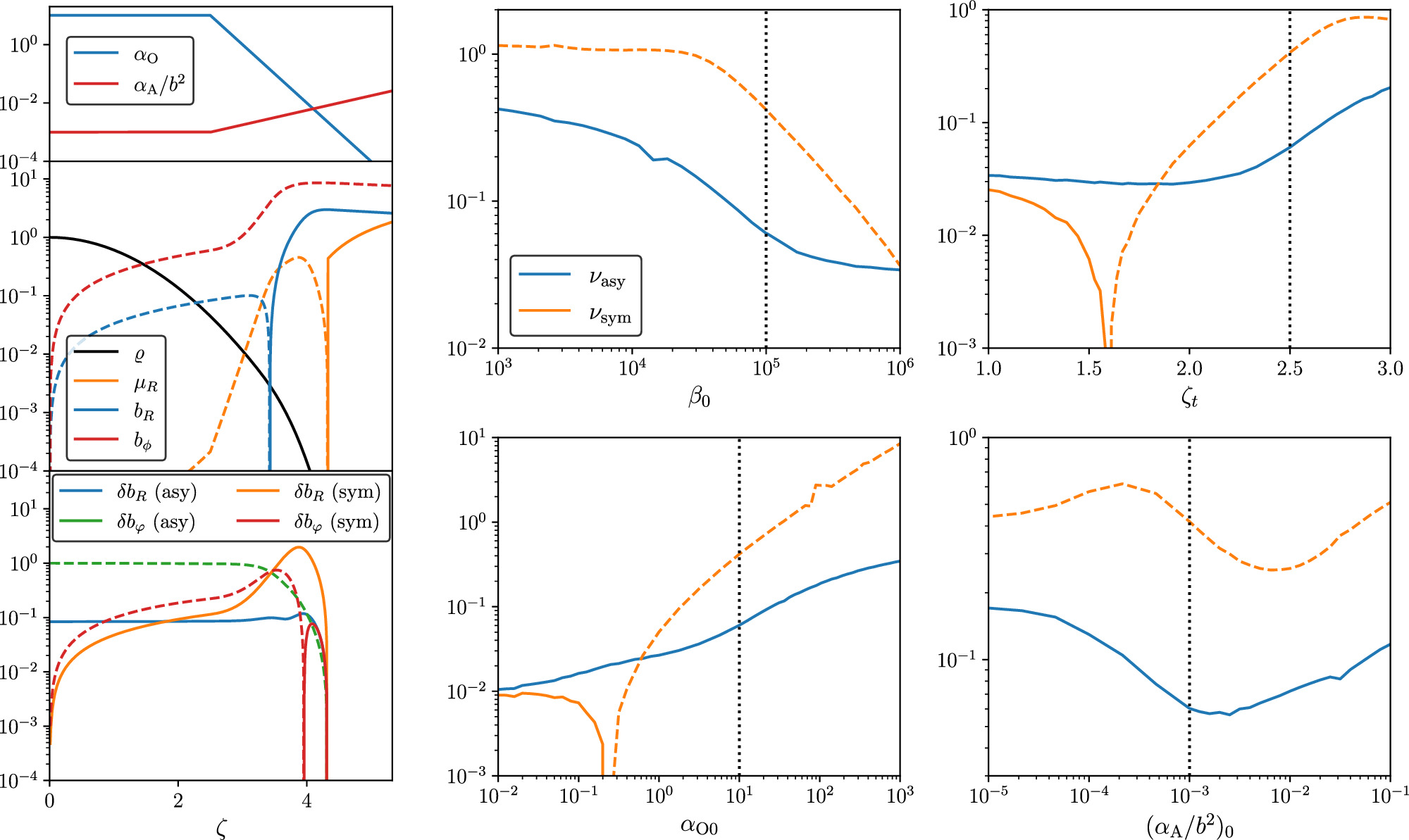 Left column illustrates the model for reference with the setup in Section 5.1, showing the diffusivity profiles (upper panel), the steady-state solution (middle panel), and the perturbation modes (lower panel). The growth rates are ν sym = −0.10 and ν asy = 0.035. Right two columns present the dependence of ν sym (orange lines) and ν asy (blue lines) on different parameters: β 0, ζ t , α O0, and ﹩{\left({\alpha }_{{\rm{A}}}/{b}^{2}\right)}_{0}﹩ (see Section 5.2). Note that negative values are shown in dashed lines. The vertical dotted lines are plotted in each panel, indicating the value taken by the reference model.