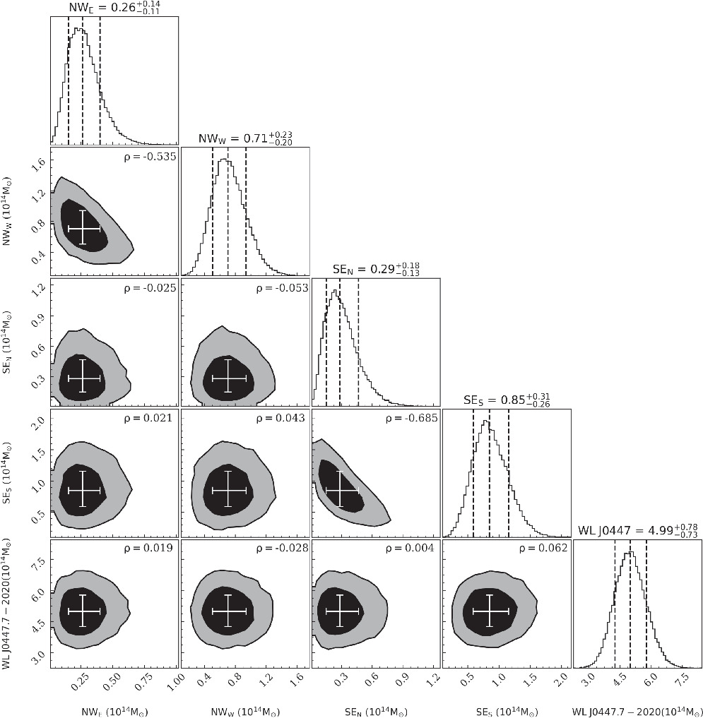 Five-halo mass estimation in the same format used in Figure 6. The mass centers were set to the convergence peaks. In some cases, where the distance between the two neighboring substructures is relatively small, the degeneracy is relatively high (the Pearson correlation coefficients are ρ = −0.535 for the NWE−NWW pair and ρ = −0.685 for the SEN−SES pair).