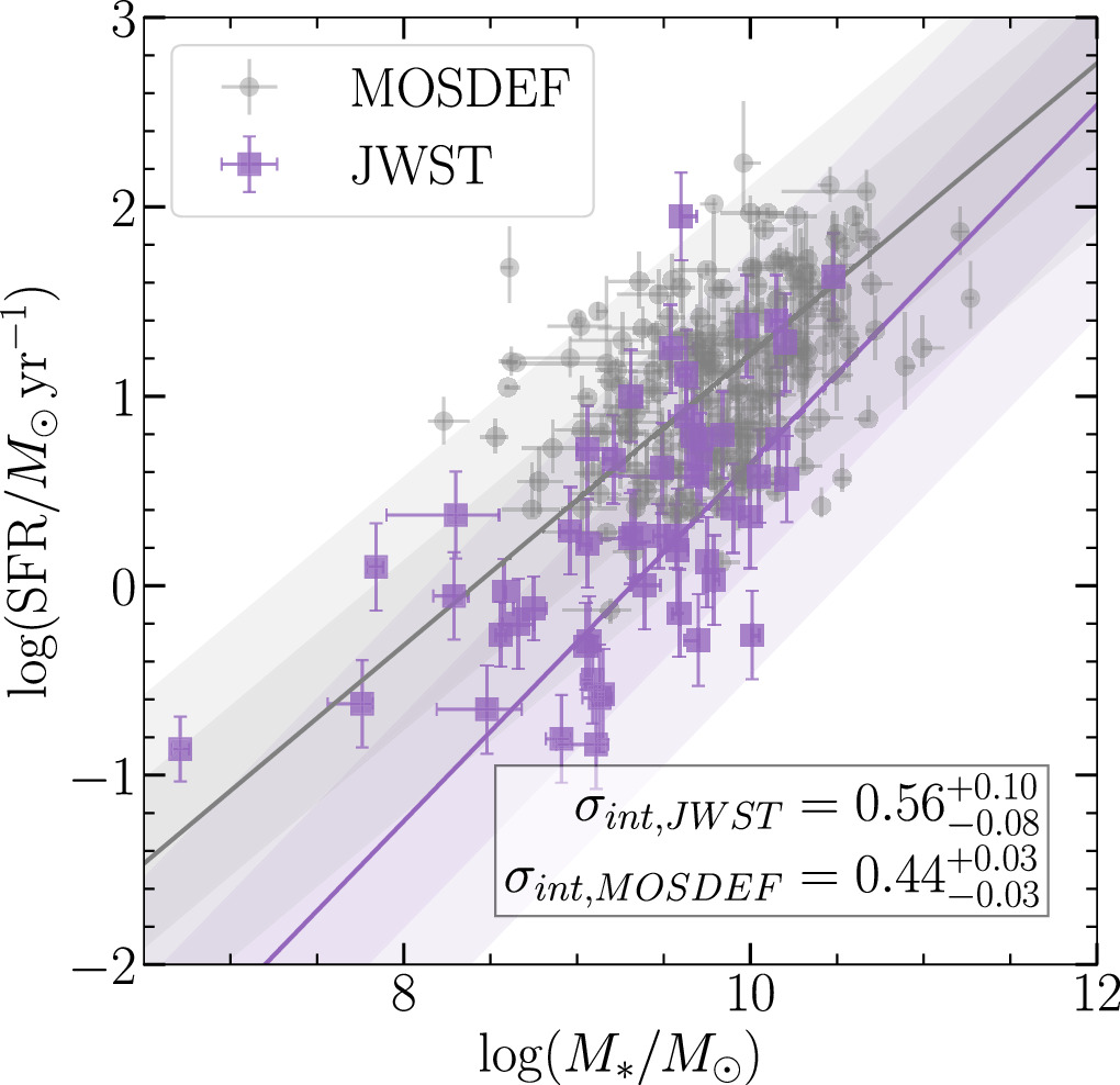 The Hα-based SFMS as determined from JWST observations in this study in the range 1.4 < z ≤ 2.7 (purple) and MOSDEF observations from R. L. Sanders et al. (2021) in the range 2.0 < z < 2.6 (gray). The MOSDEF data points have been shifted down by 0.32 dex to match the Hα luminosity to SFR conversion that we use in this paper.