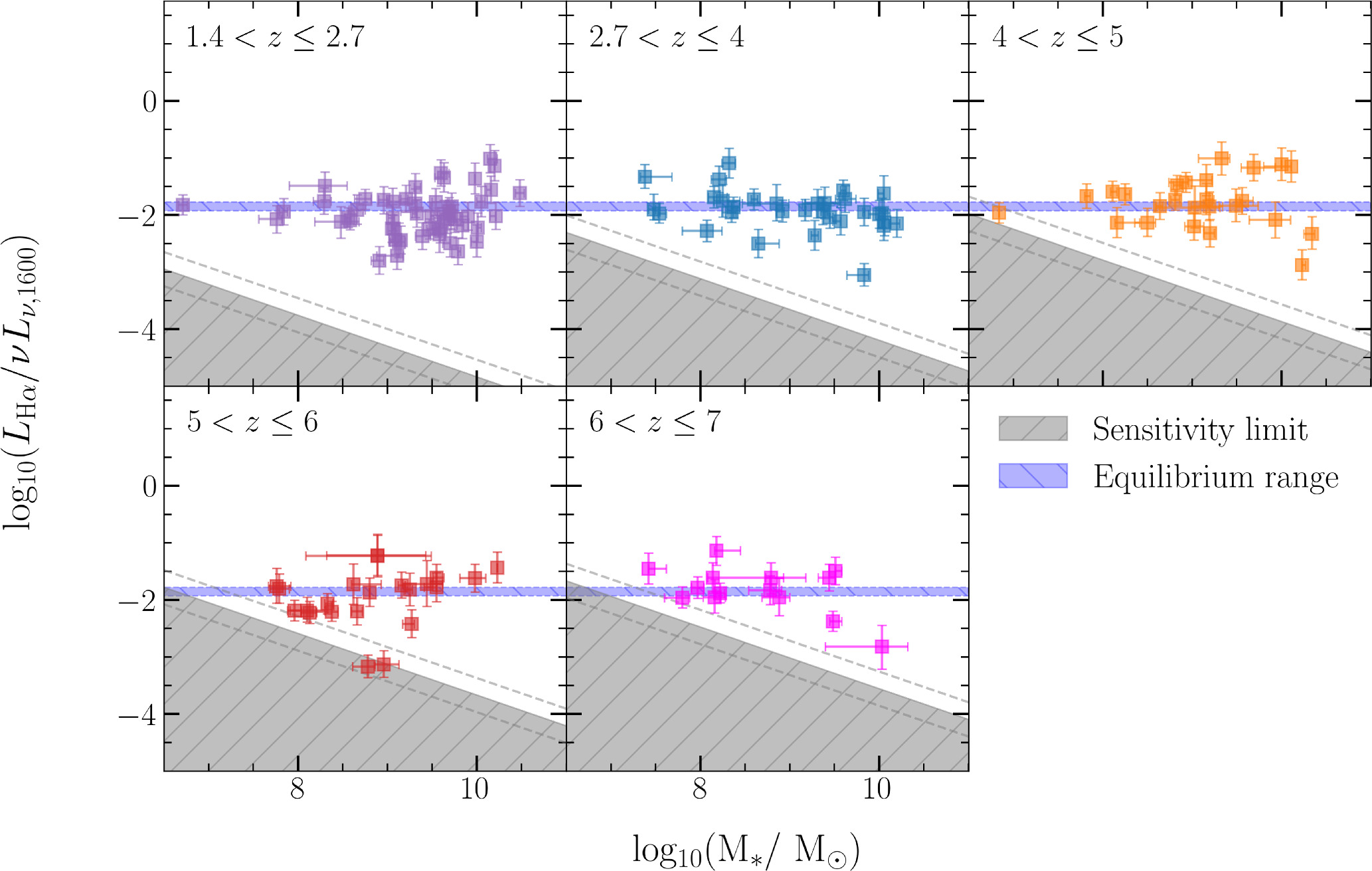 The Hα-to-UV luminosity ratio vs. stellar mass for our galaxy sample. The gray hatched region shows the parameter space that we are not sensitive to assuming a limiting survey flux and a UV luminosity to stellar mass ratio (which we derive from the parameters reported in Table 1). We take the limiting flux in our sample to be 2.0 × 10−19 erg s−1 cm−2 since this is the lowest Hα flux we observe at a significance greater than 5σ. The dashed gray lines denote the uncertainty on the region of our sensitivity limits due to the intrinsic scatter in SFR(UV) vs. stellar mass relation. The horizontal blue hatched region shows the equilibrium range of Hα-to-UV luminosity calculated by V. Mehta et al. (2023).