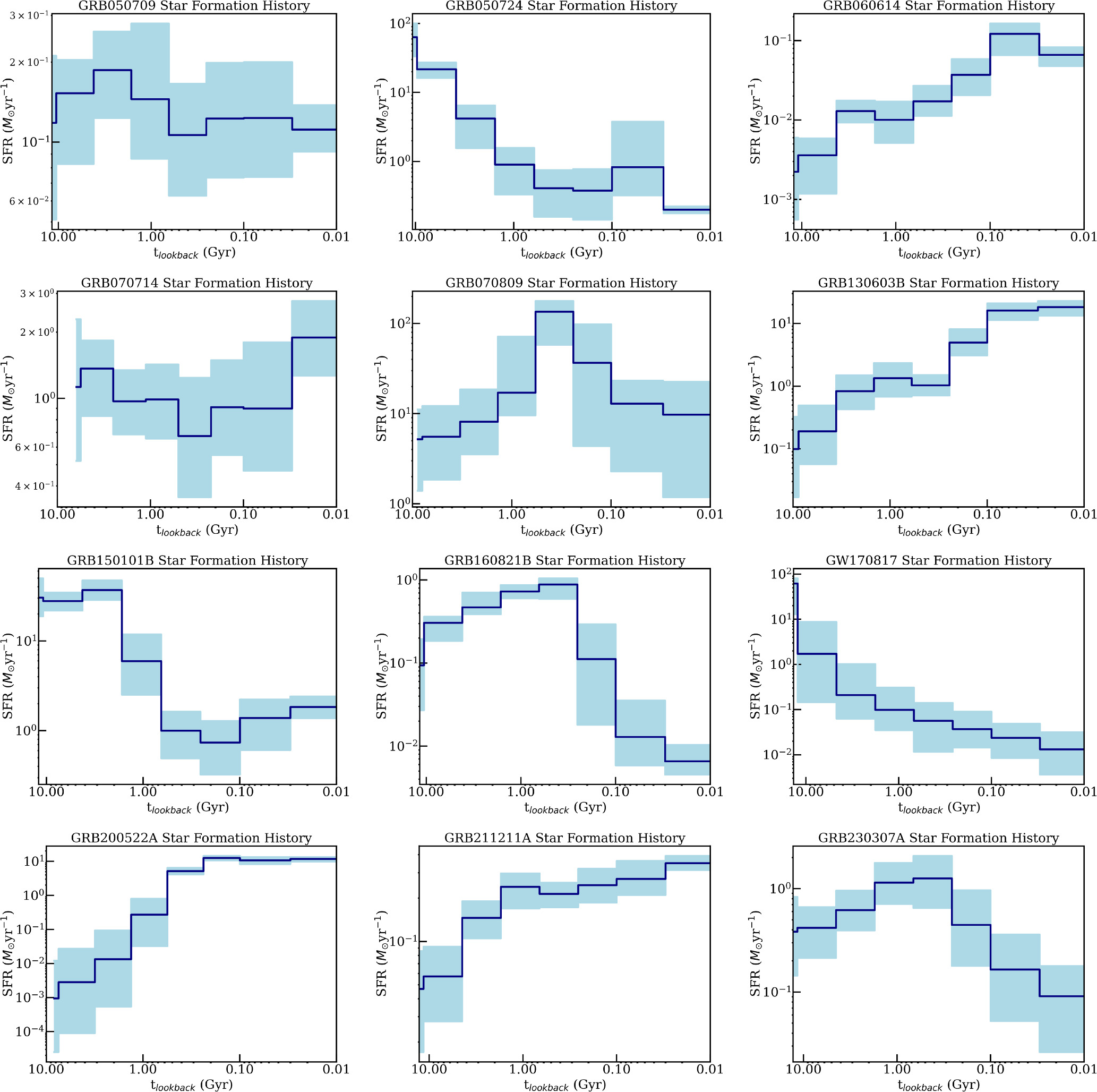 The Prospector-derived star formation histories (SFHs) of the 12 GRB-KN host galaxies in our sample. This sample has a diverse array of SFHs and recent star formation bursts, hinting that some events might be more capable of enriching their environmental star-forming gas with r-process elements than others.